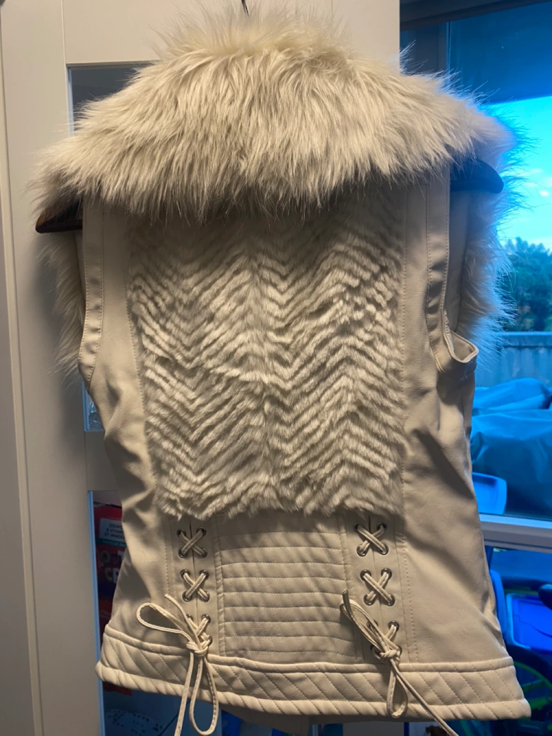 Selling a Guess faux fur vest in size XS! It's in great condition and perfect for adding a touch of glam to any outfit. The vest features a soft faux fur collar and a unique design. It has a zip front and lace up details on the back.