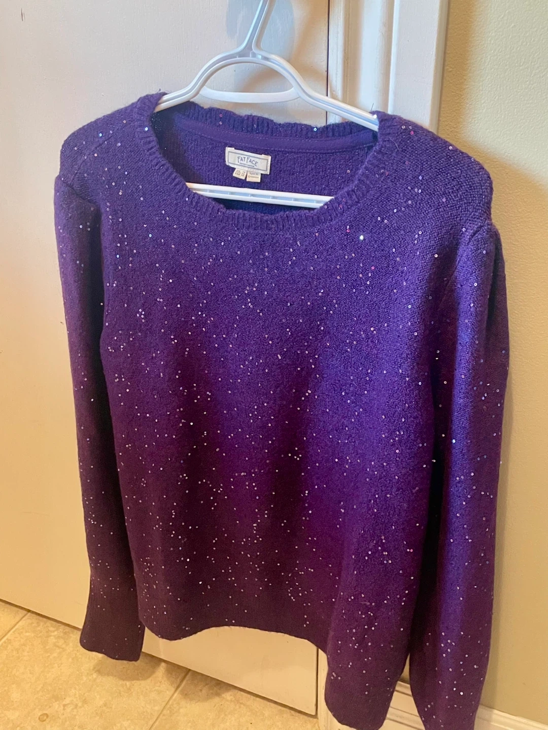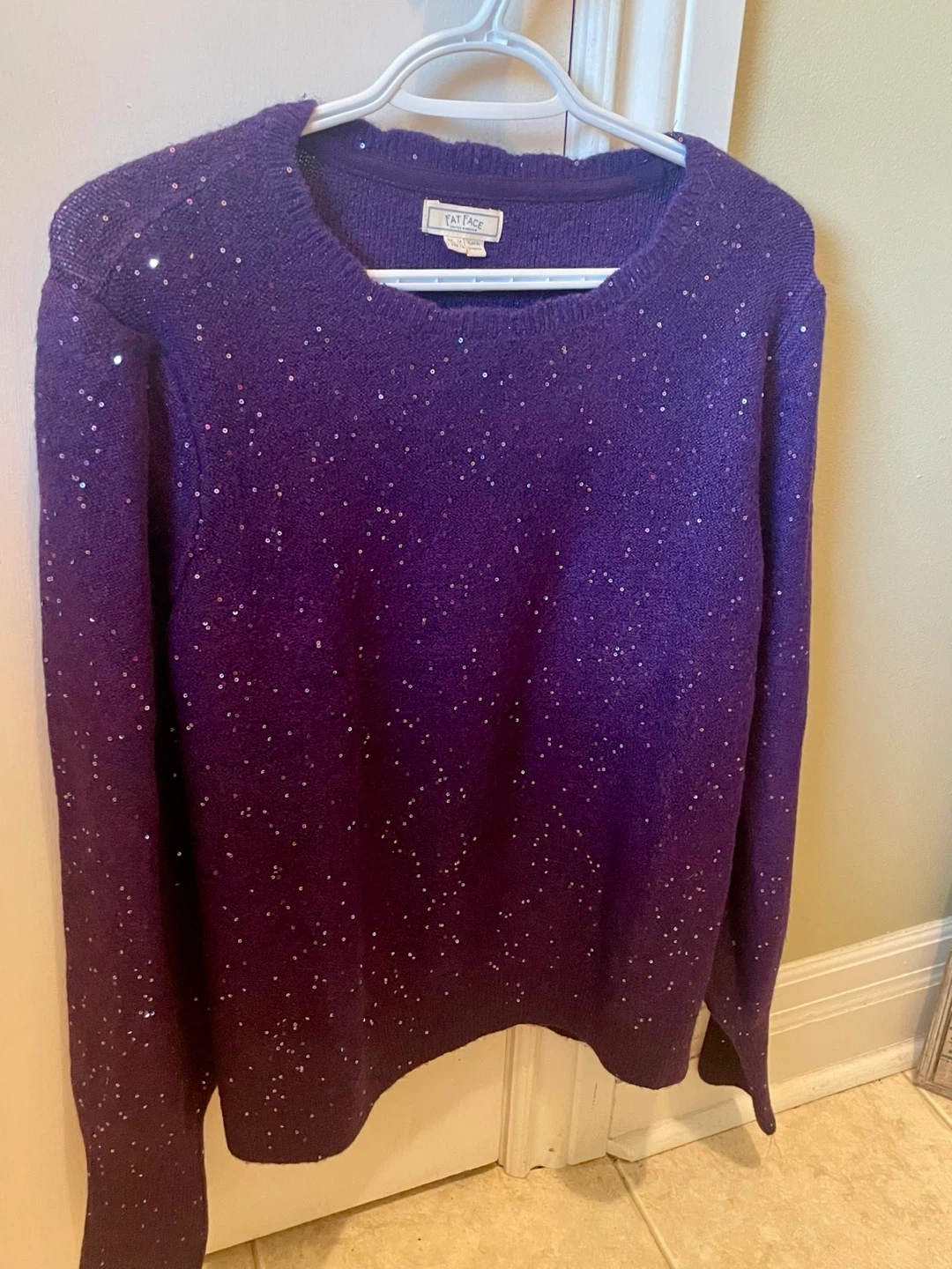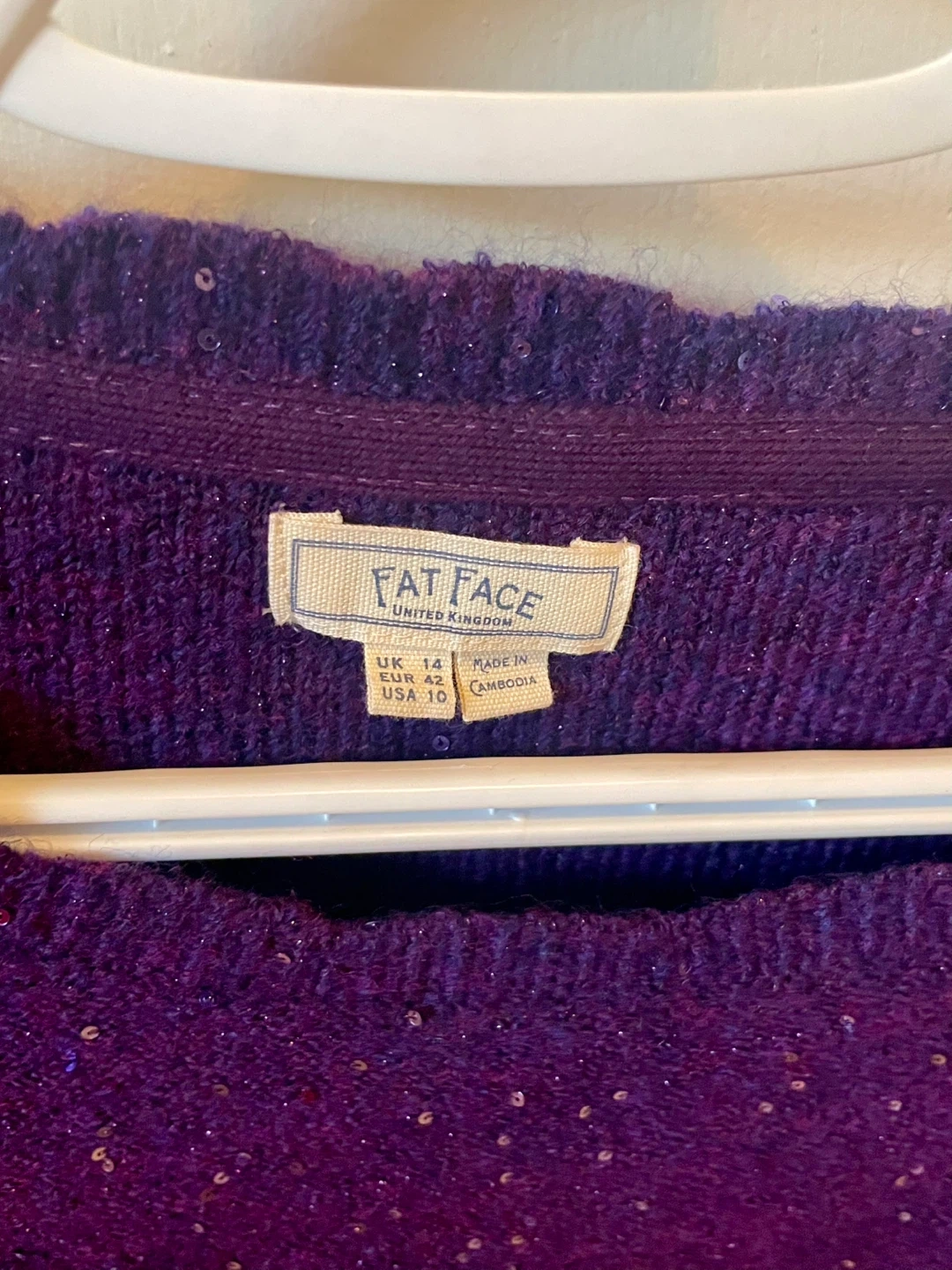 Cozy Fat Face sweater in a lovely shade of purple with subtle sparkles! It's a women's size 10 and would be perfect for adding a touch of sparkle to your wardrobe