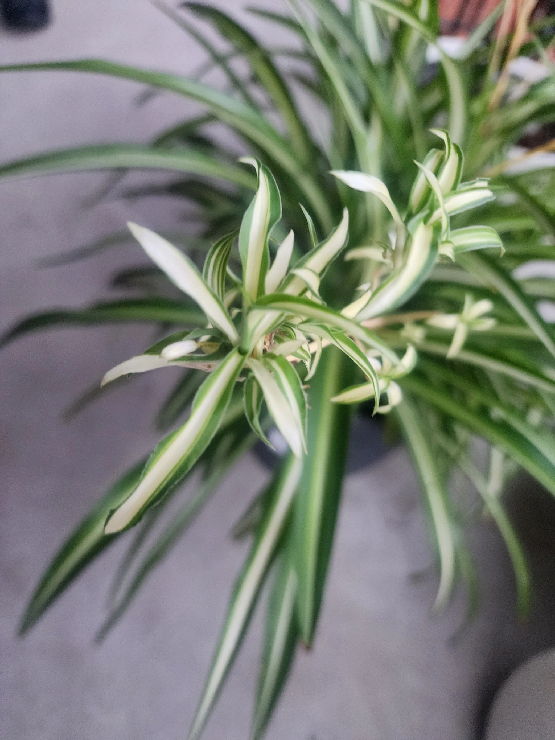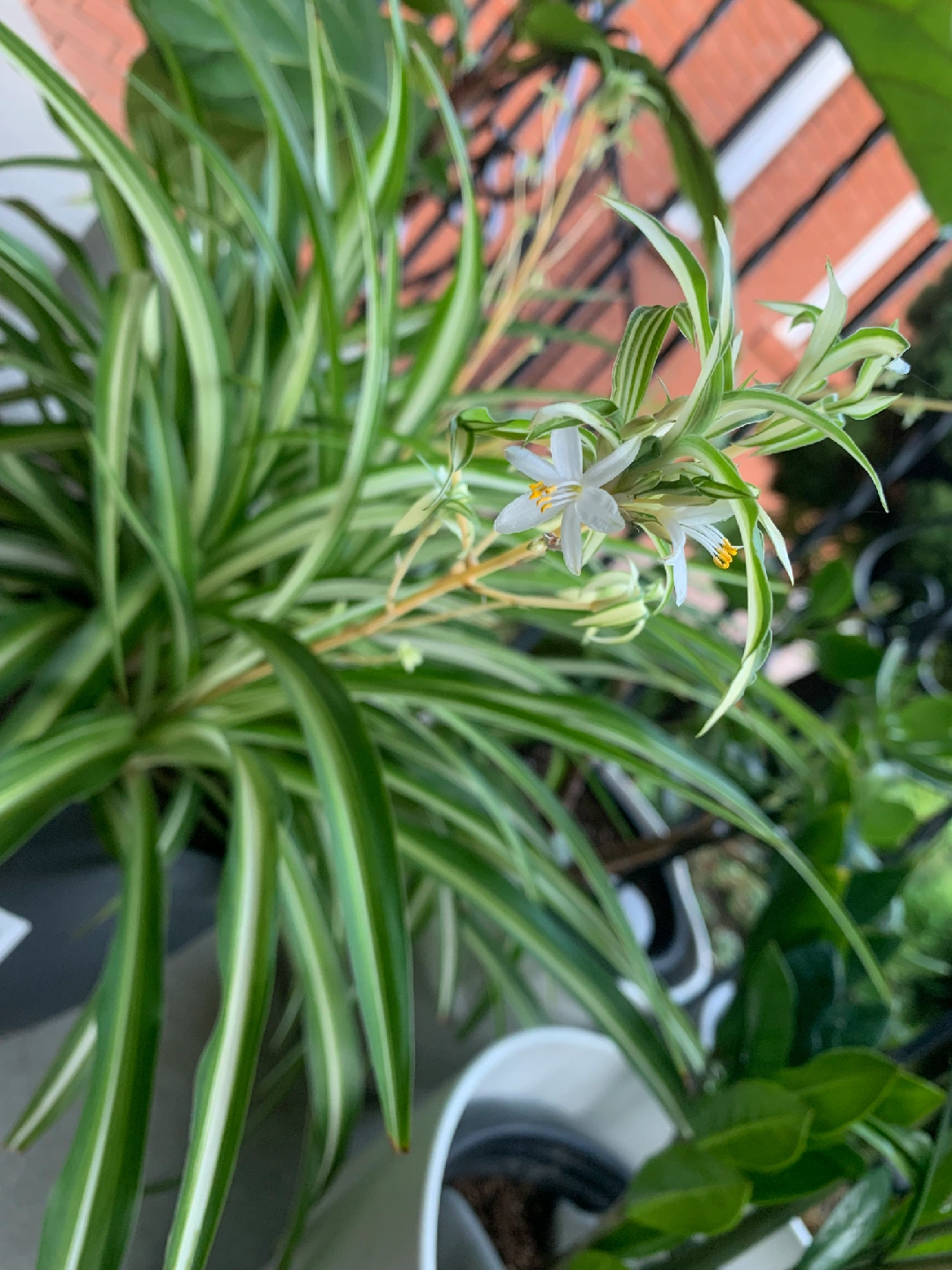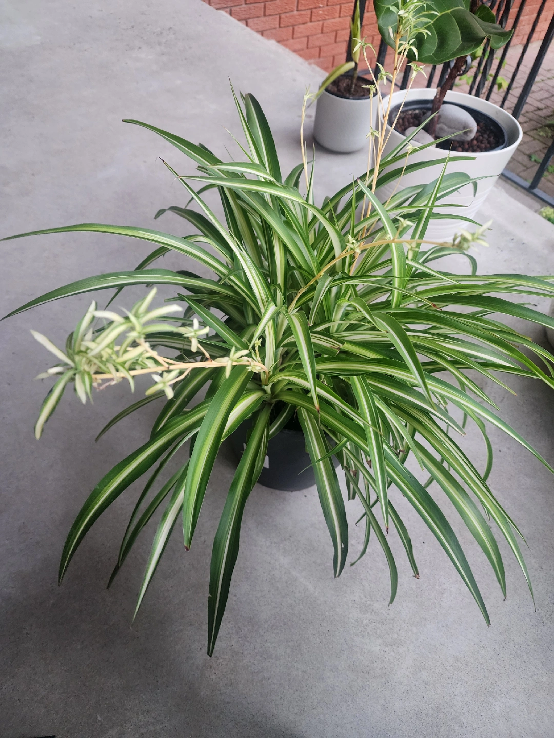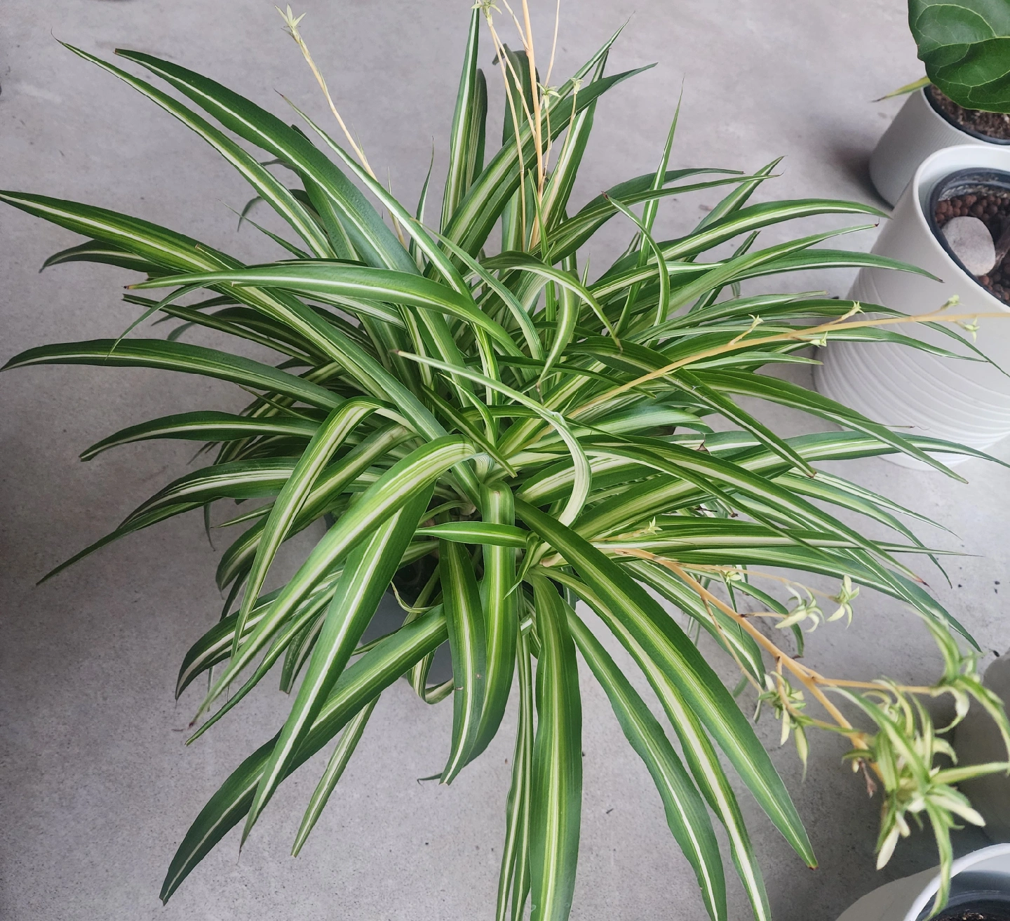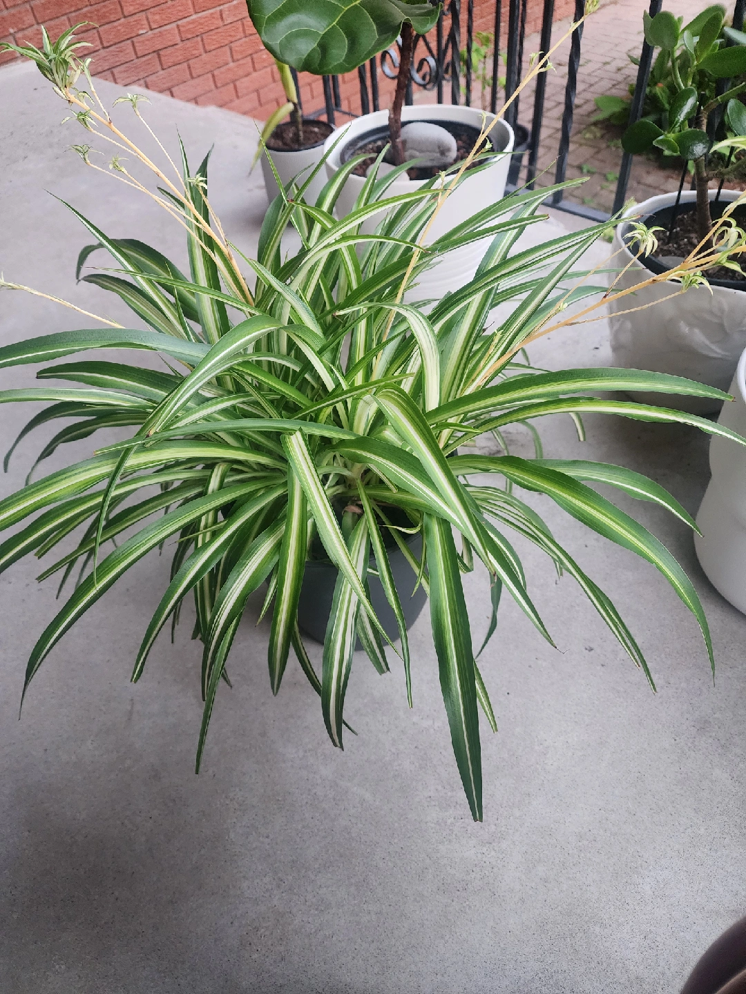 Selling a healthy spider plant! This plant is easy to care for and great for purifying the air in your home. It's got lovely green and white striped leaves and is ready to bring some life to your space