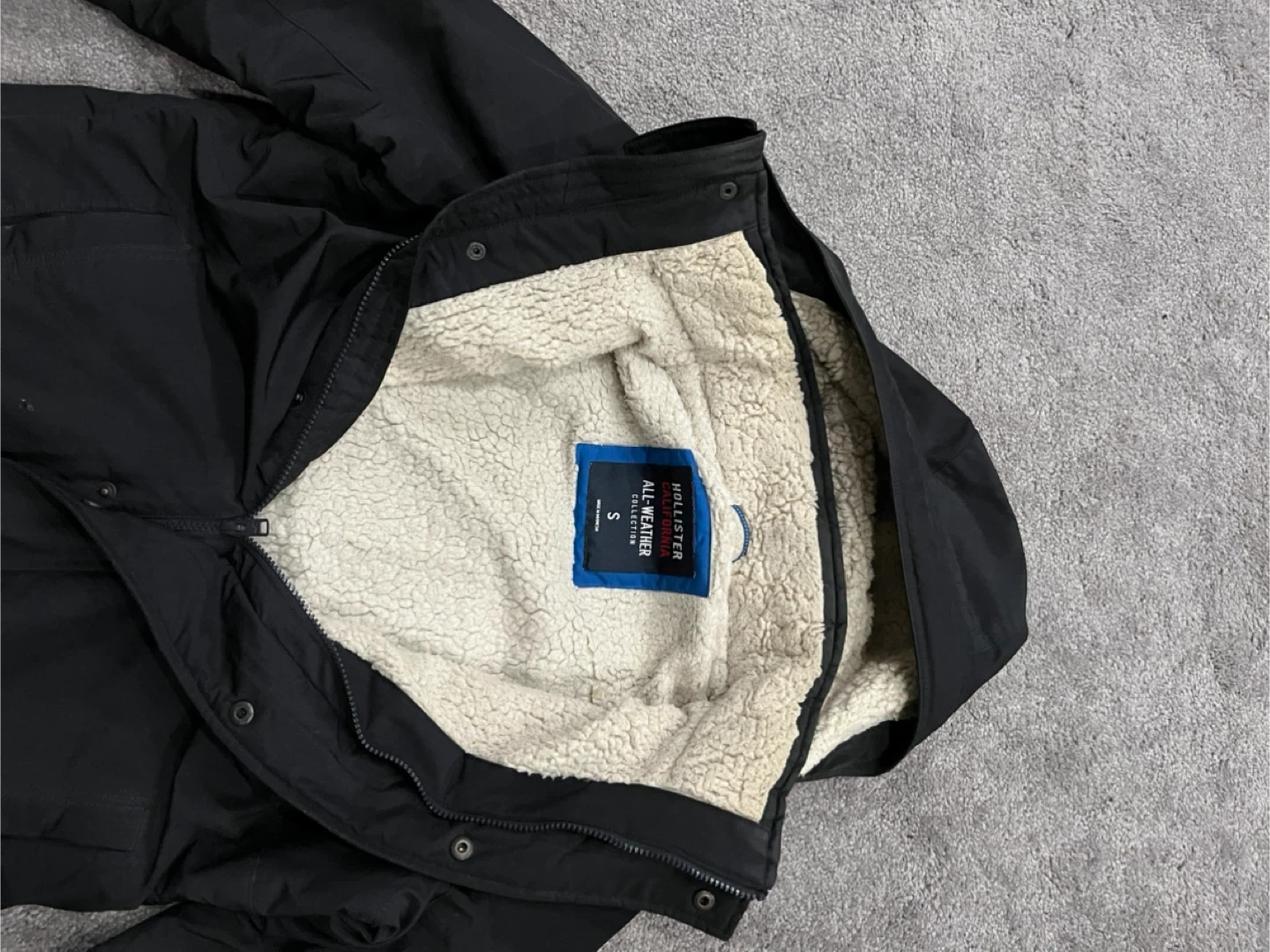 Selling a Hollister All Weather jacket in size small. It's black with a cozy, sherpa-style lining. Perfect for keeping warm and dry!