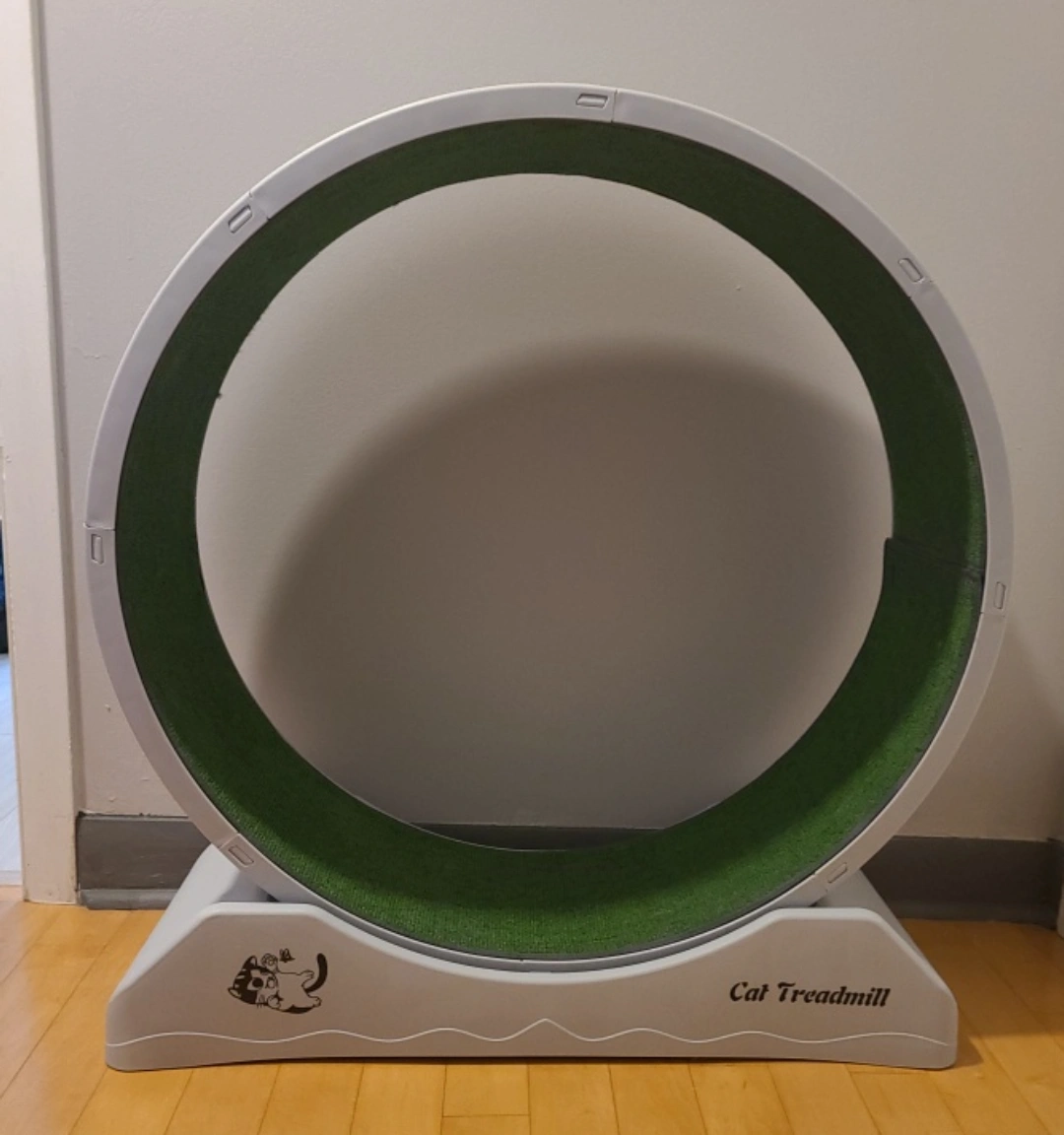 Selling a cat treadmill exercise wheel! It's in great shape and perfect for keeping your furry friend active indoors. The green carpet provides a comfortable surface for your cat to walk or run on. It's a fun way to help your cat stay fit and burn off energy.
