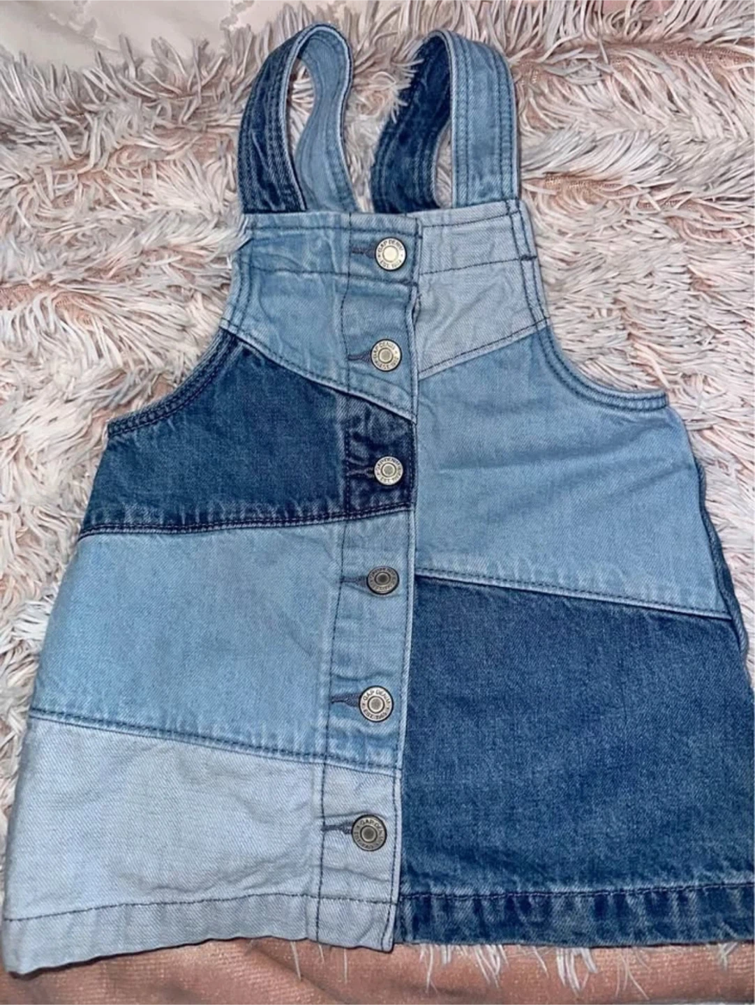 Here's a cute Baby Gap denim dress for your little one! It's sized for 18-24 months and features a patchwork design in various shades of blue denim. Perfect for a toddler!