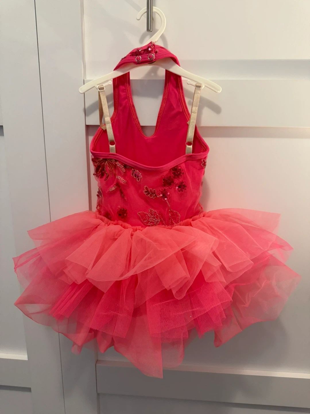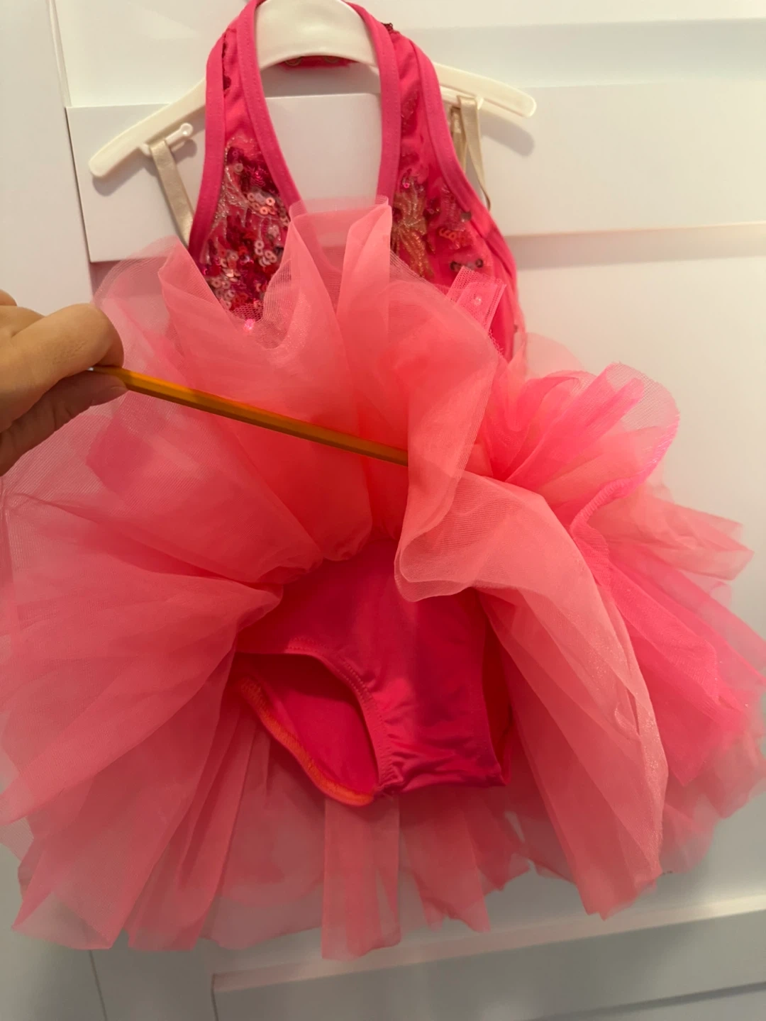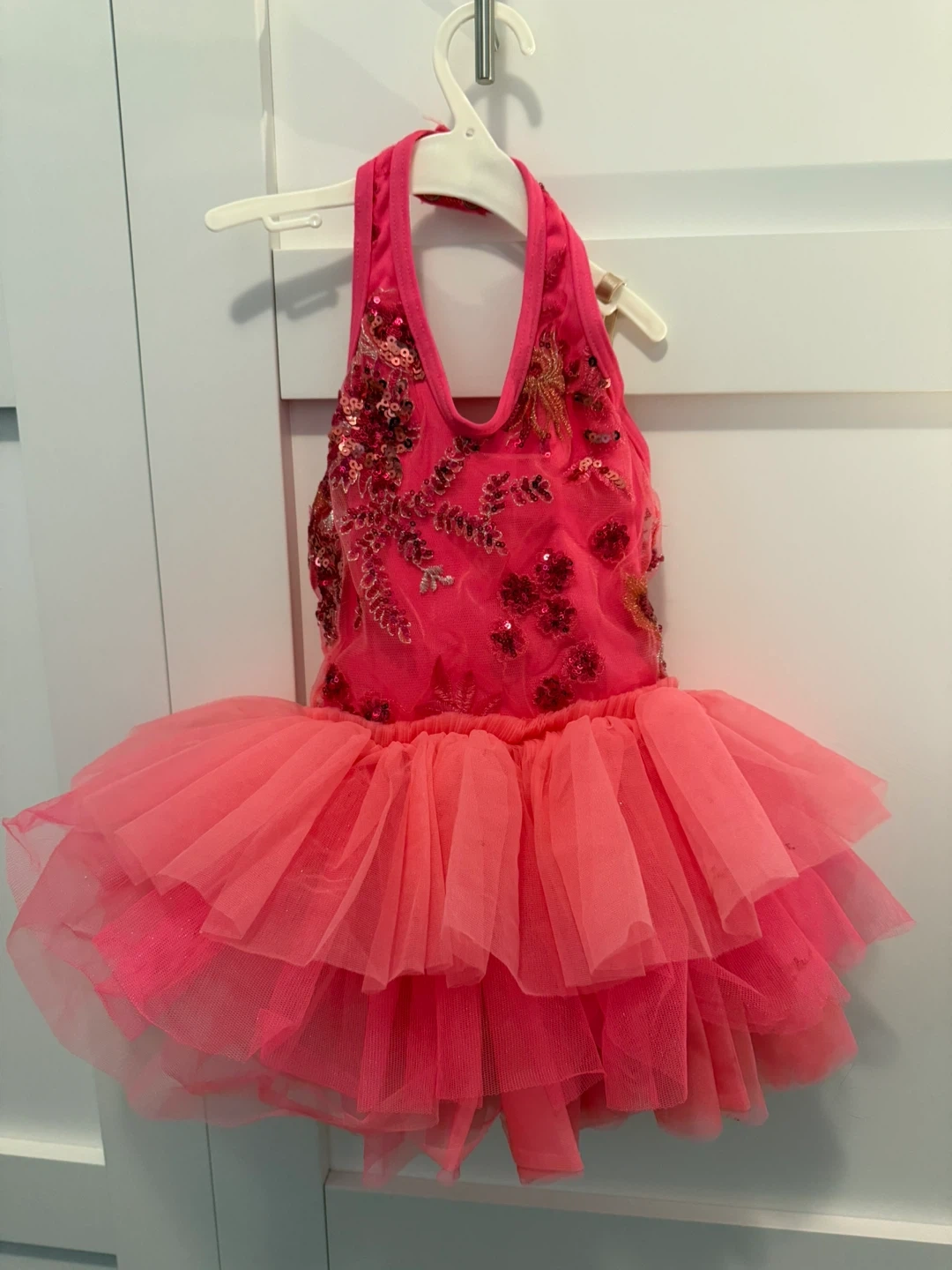 Dress up or Halloween! A very cute pink dance leotard with a tutu skirt! It's in great condition and ready for your little dancer to twirl and leap. The bodice is decorated with sequins and the skirt is a multi-layered tutu. Perfect for dance class, Halloween, or dress-up!