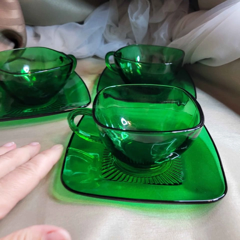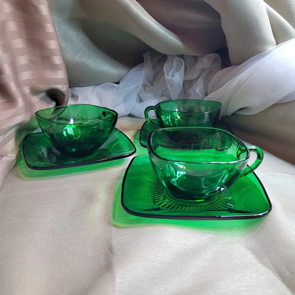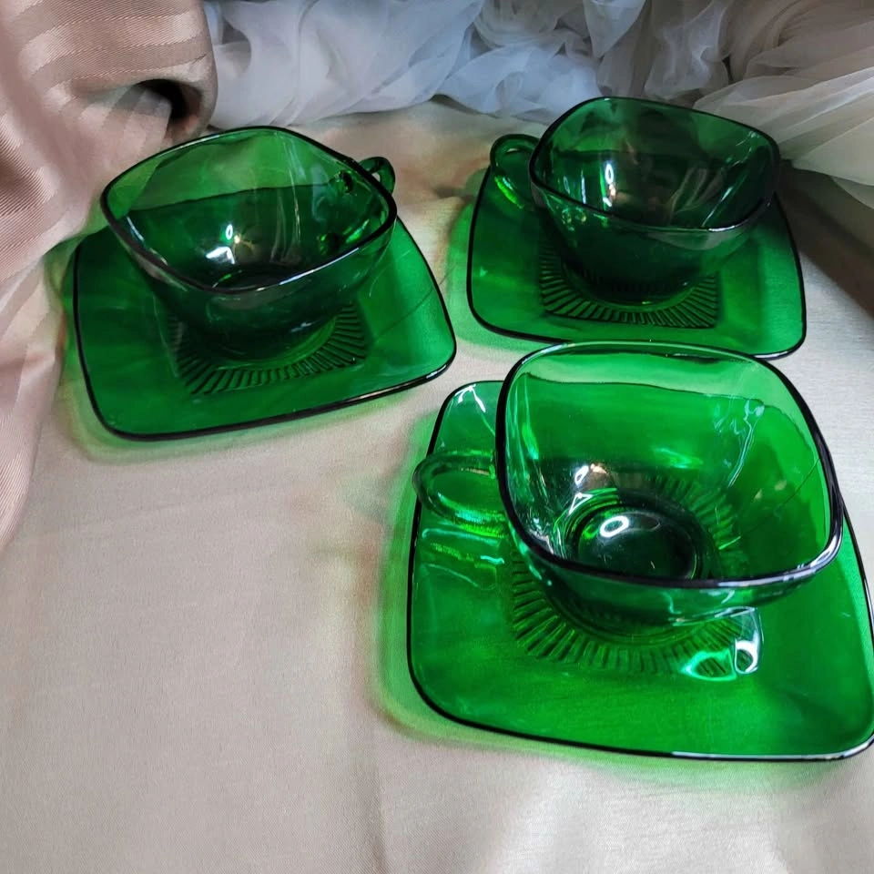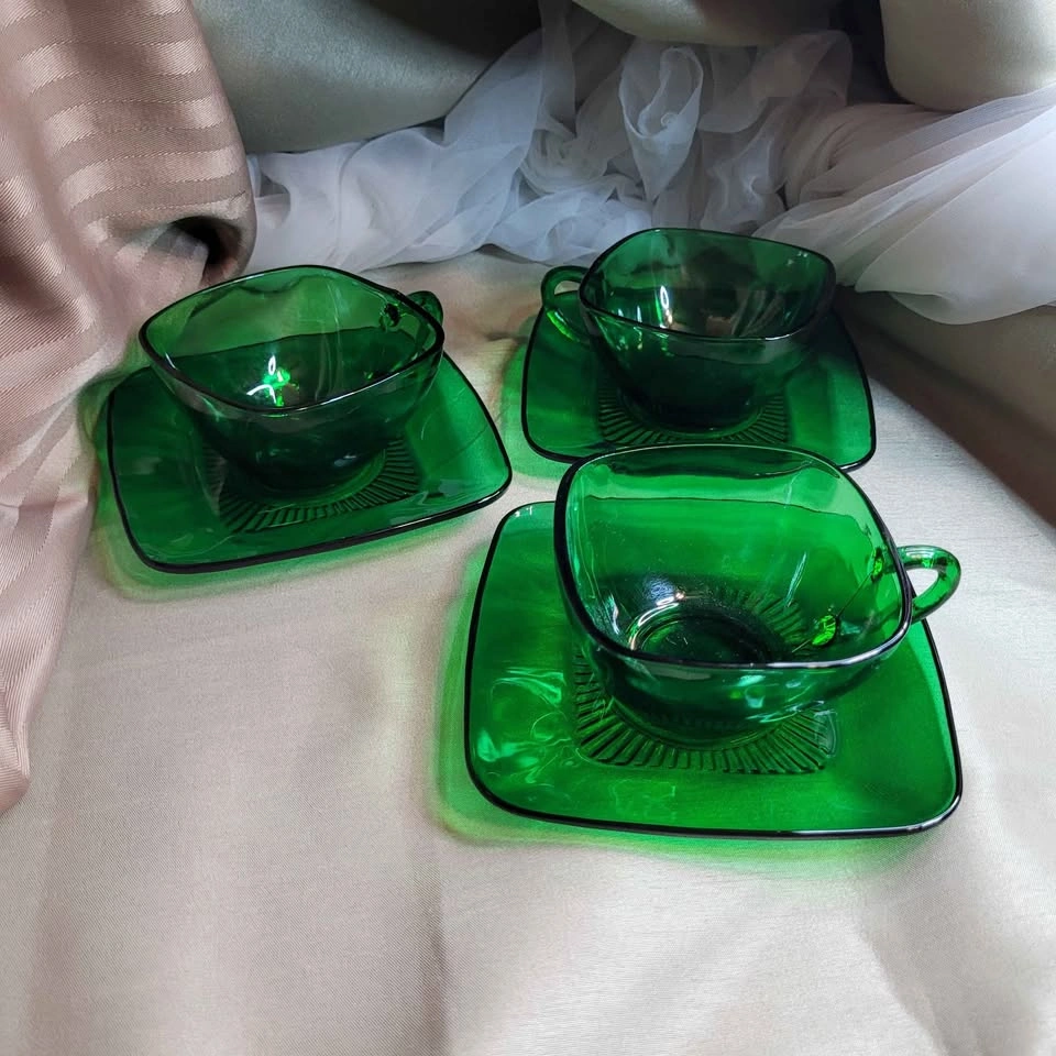 Beautiful Set of 3 Anchor Hocking Fore King Forest Green Charm Cup and Saucer Set- 6 pc Set - Excellent Condition please see all Pictures. Please See all my Other Listings, Bundle & Save for a Better Deal! Located in Bradford, May be able to Meet, sorry no holds without an ET, Thank you so much for Looking!