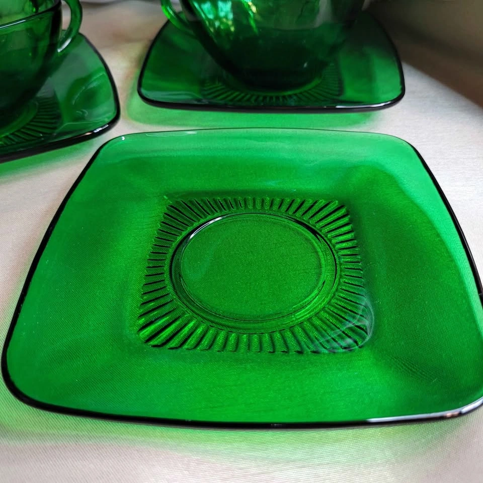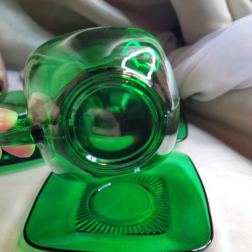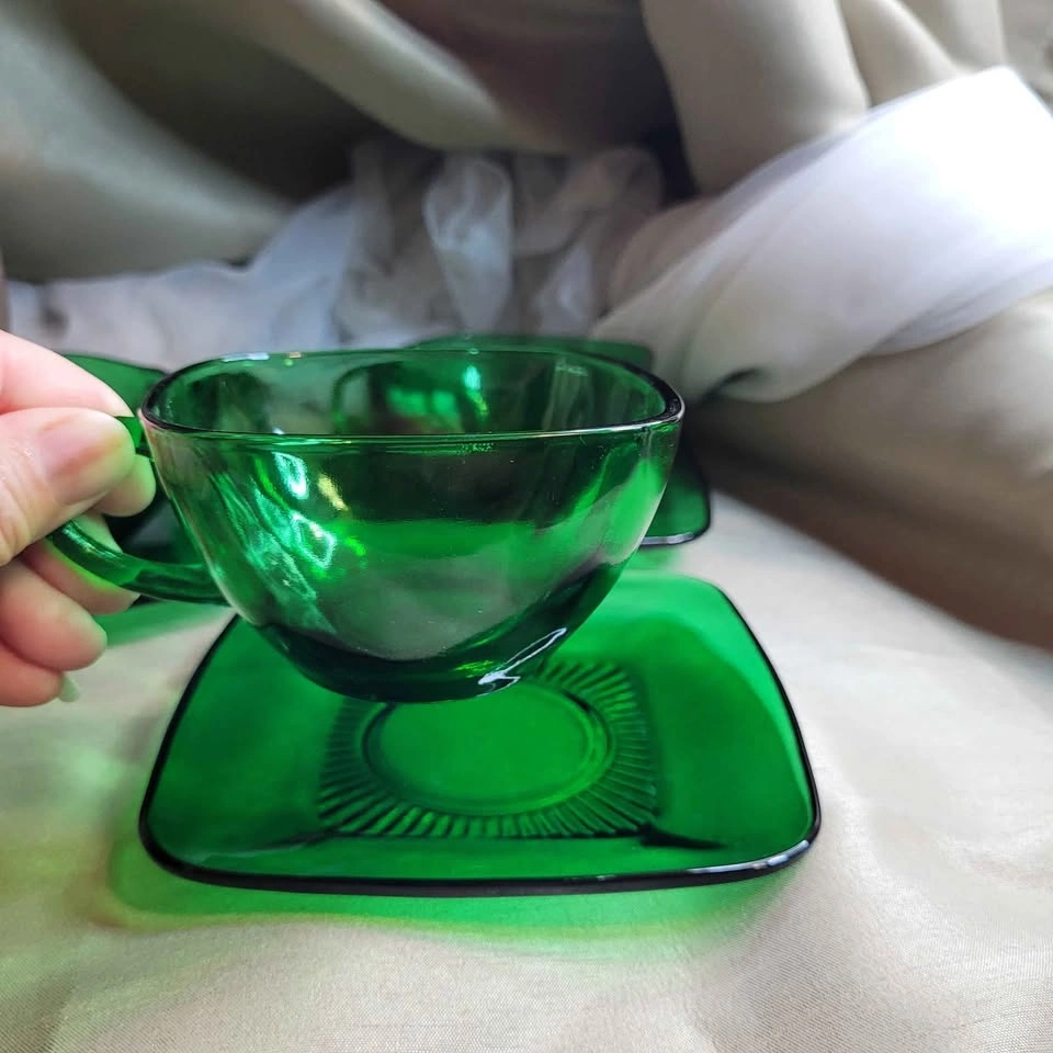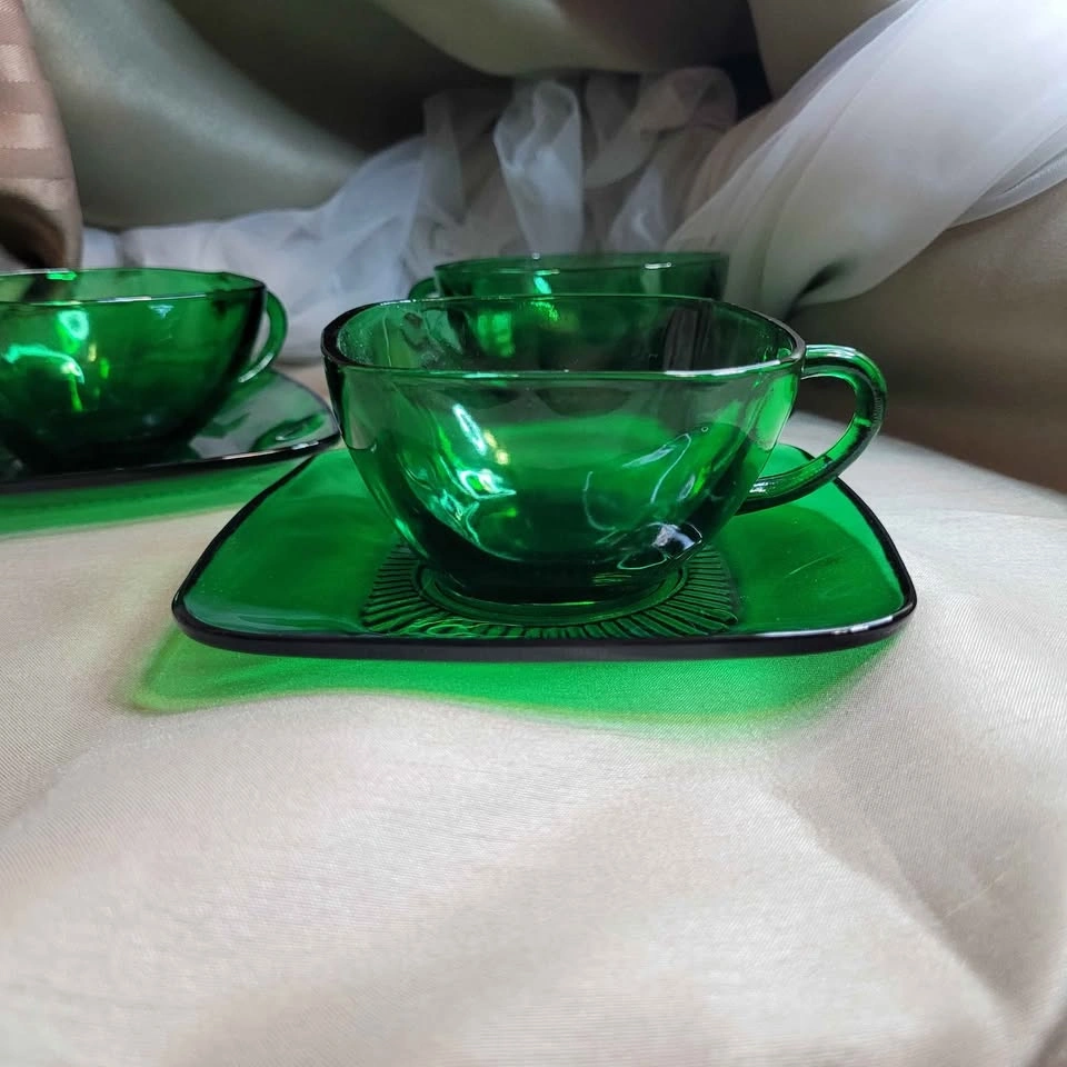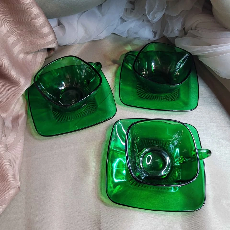 Beautiful Set of 3 Anchor Hocking Fore King Forest Green Charm Cup and Saucer Set- 6 pc Set - Excellent Condition please see all Pictures. Please See all my Other Listings, Bundle & Save for a Better Deal! Located in Bradford, May be able to Meet, sorry no holds without an ET, Thank you so much for Looking!