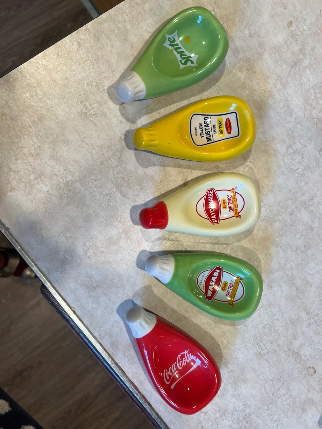 Selling a set of fun, novelty dip trays shaped like classic sauce bottles! Includes Sprite, Wasabi, Mayonnaise, Yellow Mustard, and Coca-Cola designs. Perfect for adding a bit of fun to your next snack or party