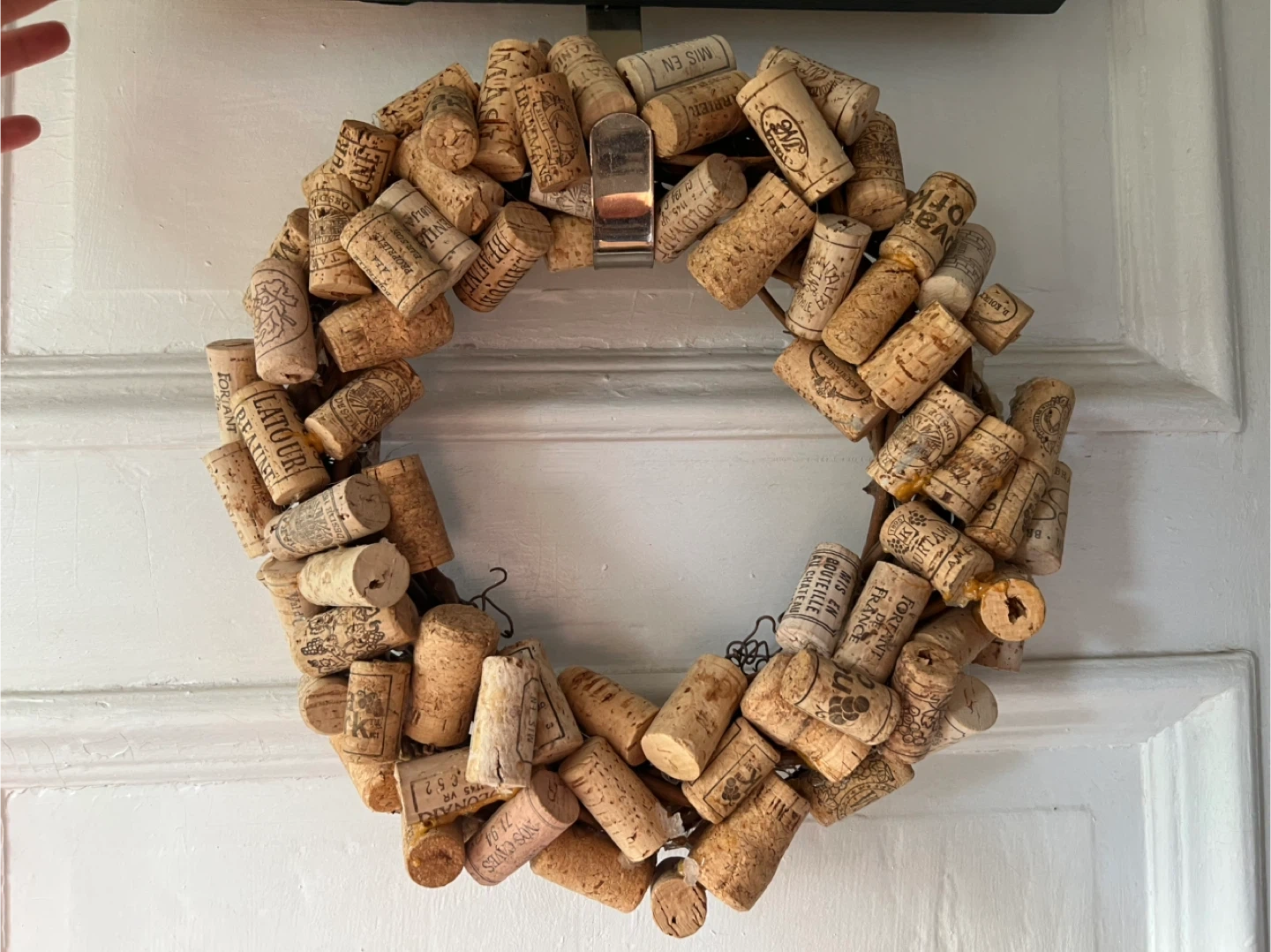 Selling a unique, handmade wreath made from wine corks. It's a great conversation starter and a fun piece of decor for any wine lover's home. The corks have various winery names and designs, adding to its charm!