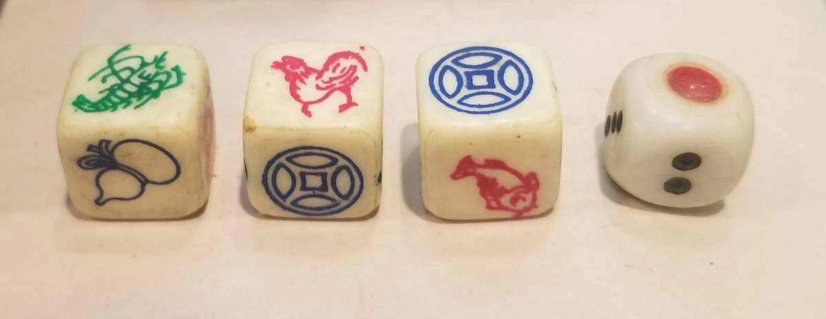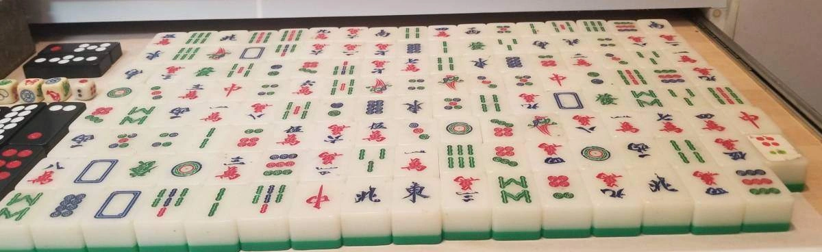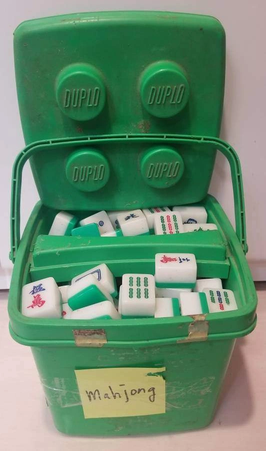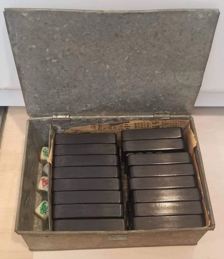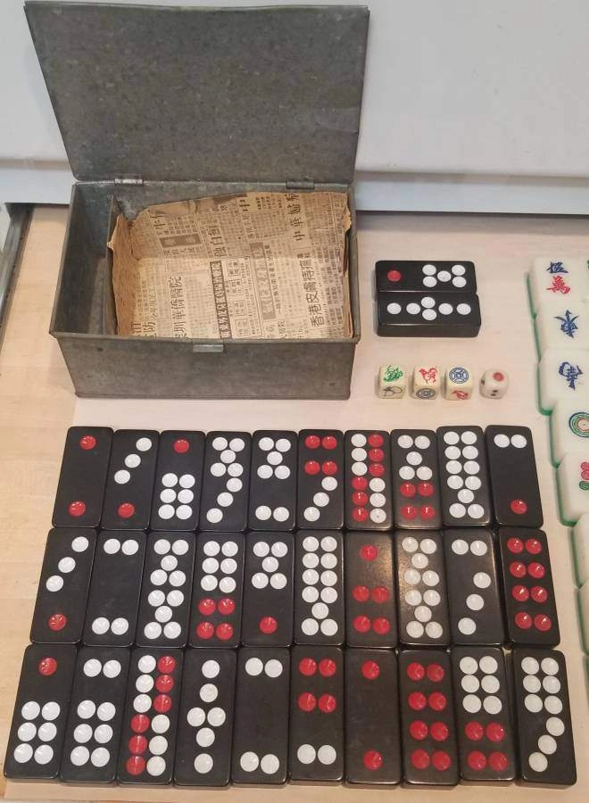 Vintage Chinese Mahjong & Domino Game Sets – Complete in Cases E-Transfers Accepted Pick Up Anytime A rare pairing of vintage Chinese game sets, perfect for collectors, players, or display. Set 1: Mahjong (Green DUPLO Case) Classic Chinese Mahjong set Engraved and painted tiles (bamboo, characters, circles, winds, dragons) Includes dice Conveniently stored in green DUPLO case Price: $95 CAD Set 2: Dominoes (Metal Case) Vintage Chinese black bakelite/early plastic domino set White and red pips, complete set Original metal storage box with Chinese newsprint liner Includes symbolic dice with rooster, fish, and other figures Price: $110 CAD Group Price (Both Sets Together): $175 CAD mahjong tiles set chinese domino set vintage pai gow tiles bakelite dominoes chinese games collectibles