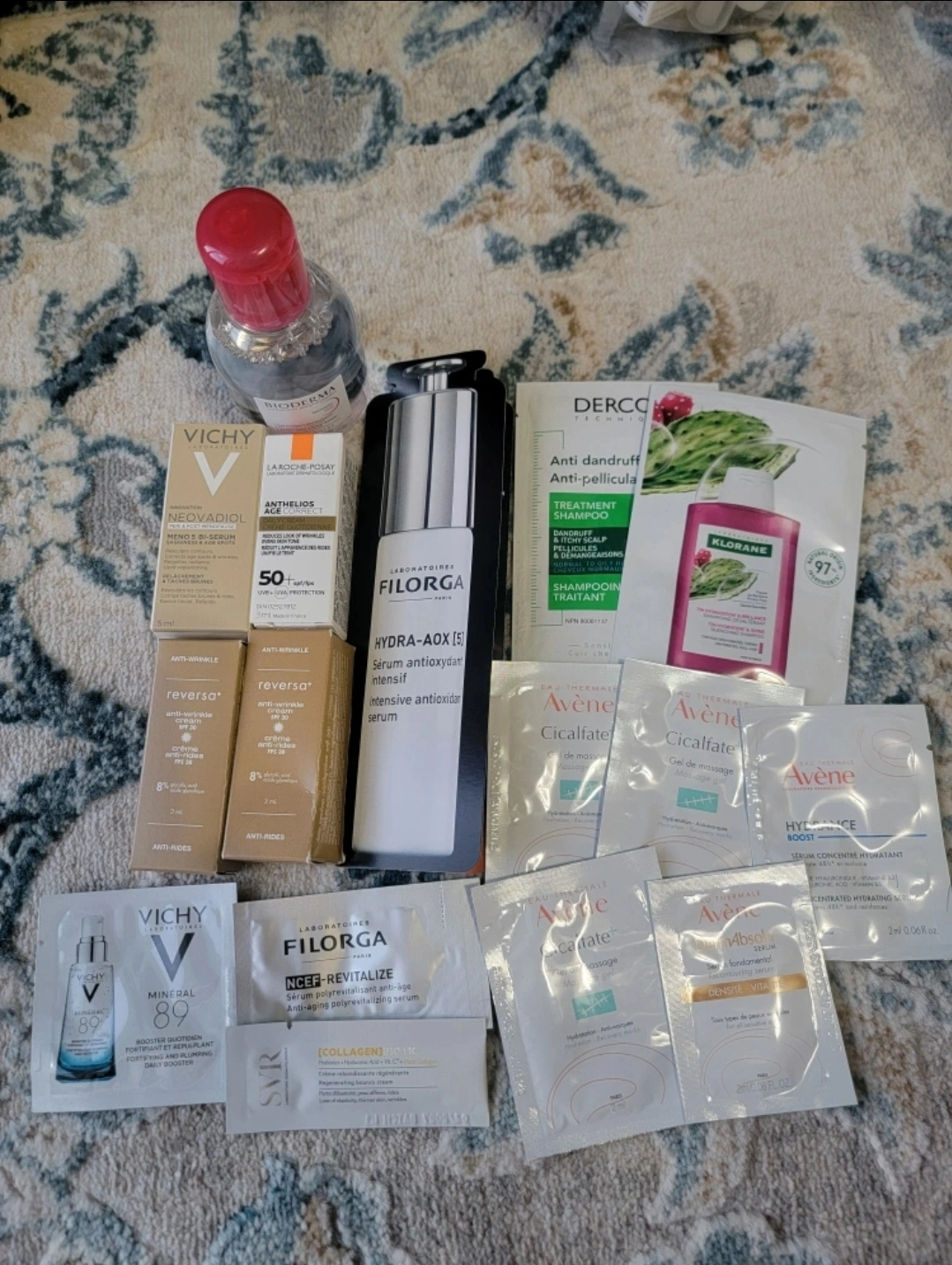 A collection of skincare samples including brands like Vichy, La Roche-Posay, Filorga, Avène, Klorane, and Bioderma! Perfect for trying out new products or travel. $5 for all!!