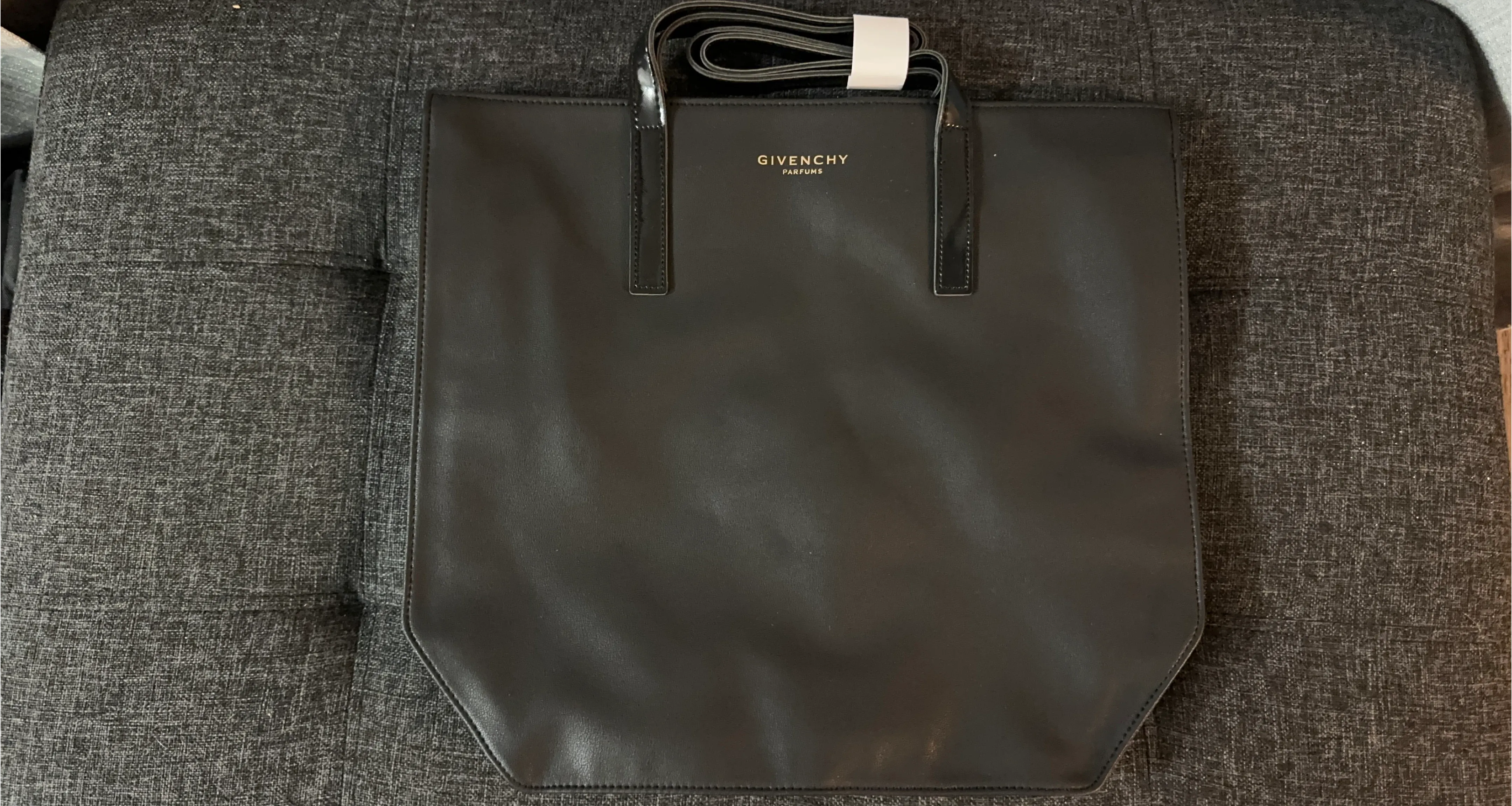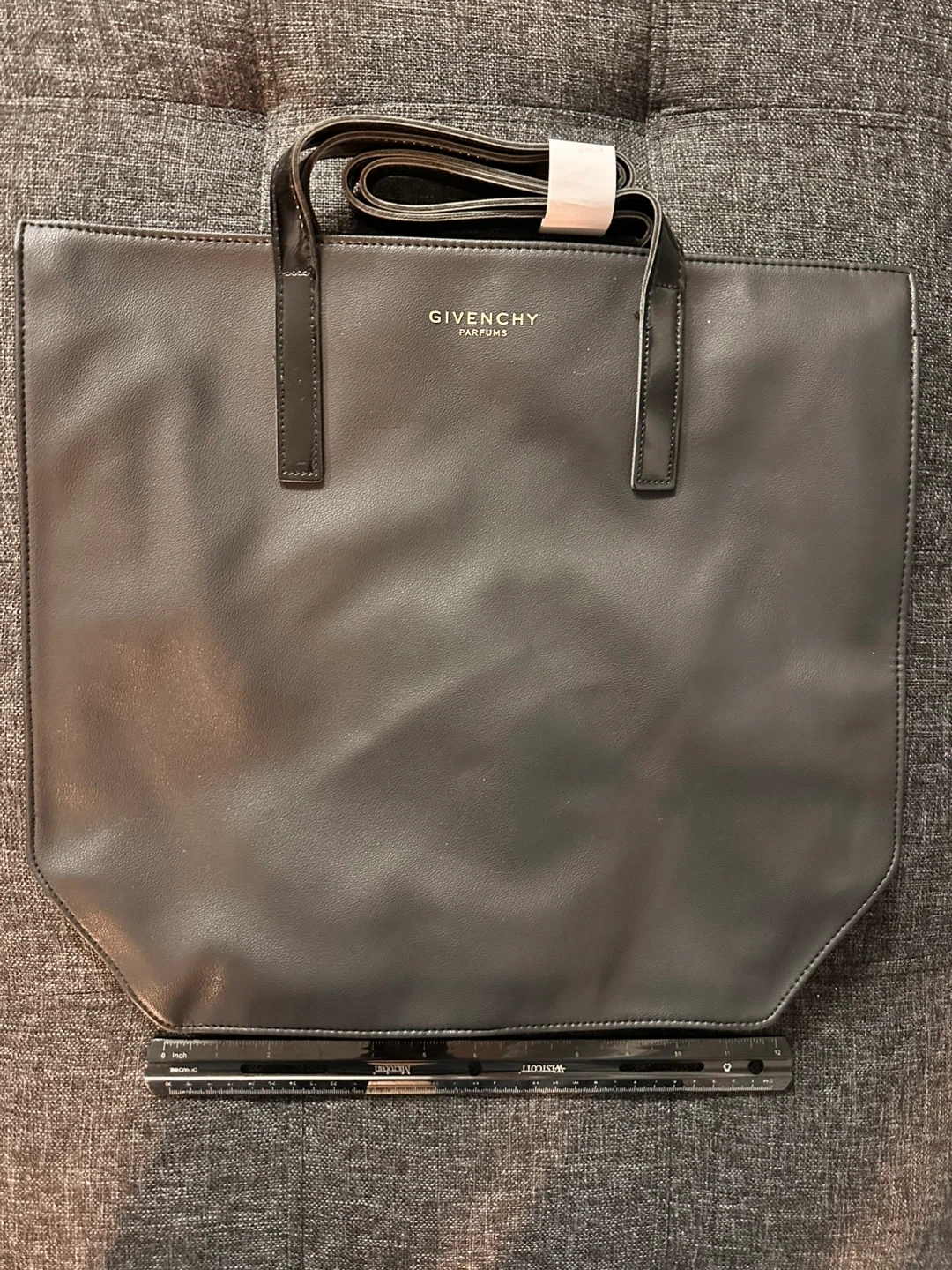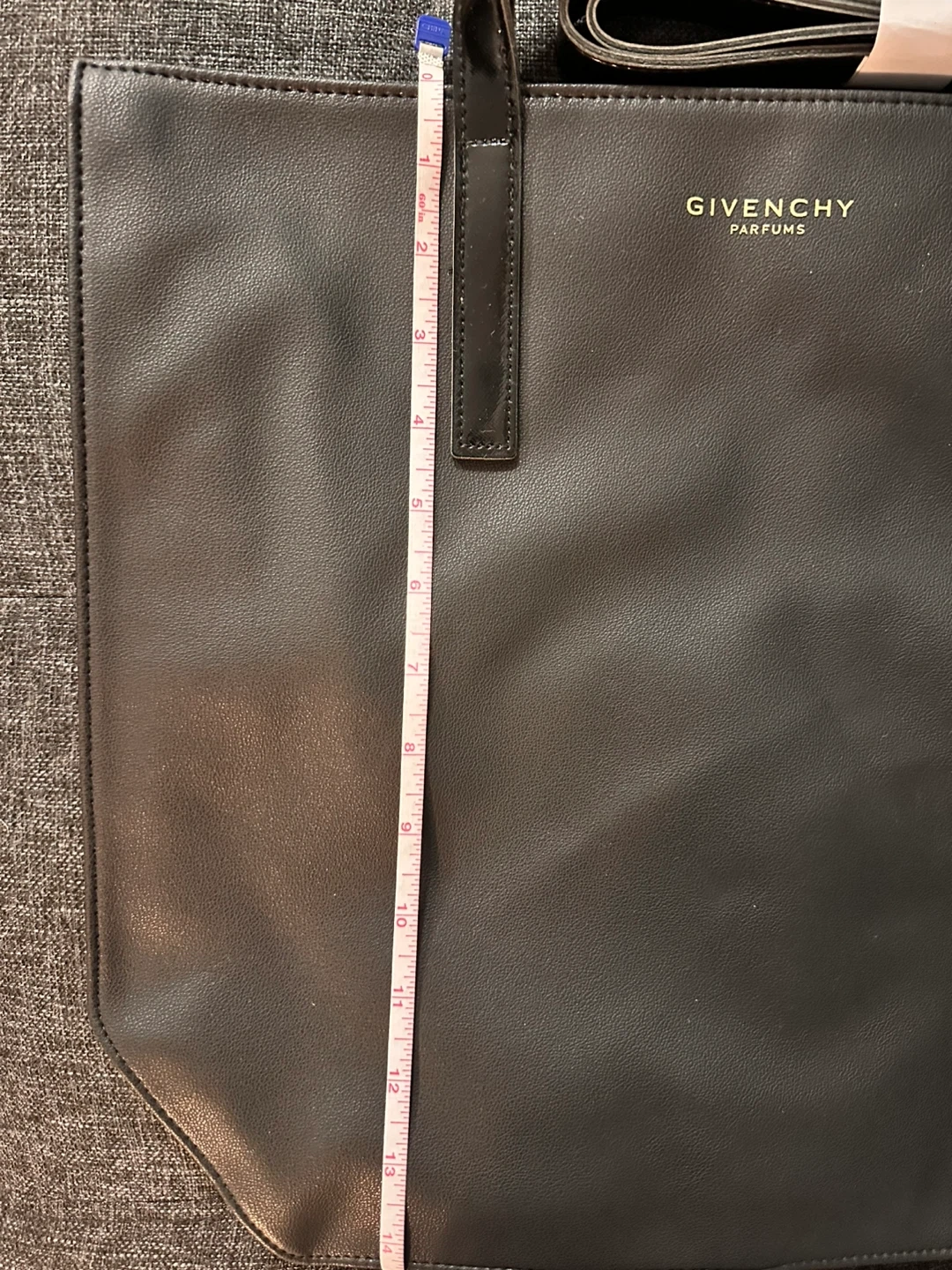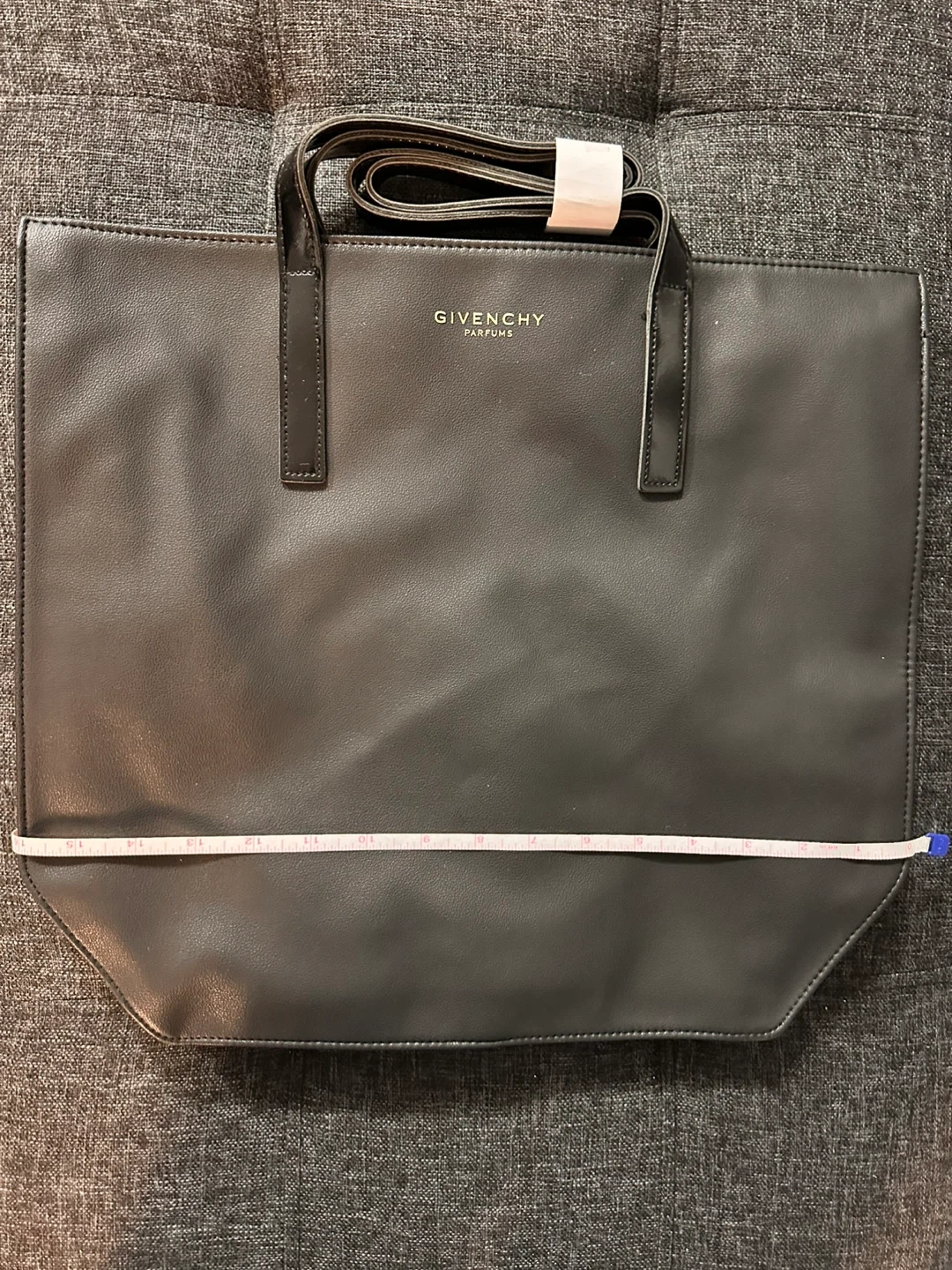 Selling a brand new Givenchy Parfums tote bag! It's a sleek black colour and appears to be made of faux leather. Perfect for carrying your essentials in style. The bag measures approximately 16” in width, 14” height and 2” in depth.