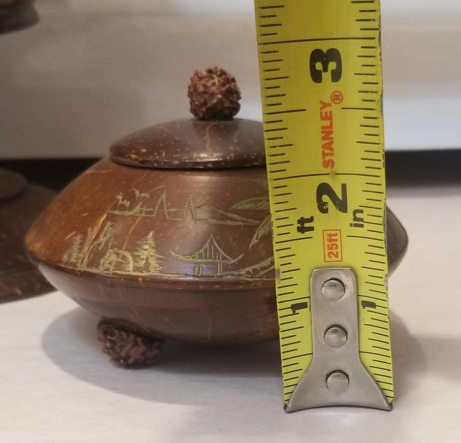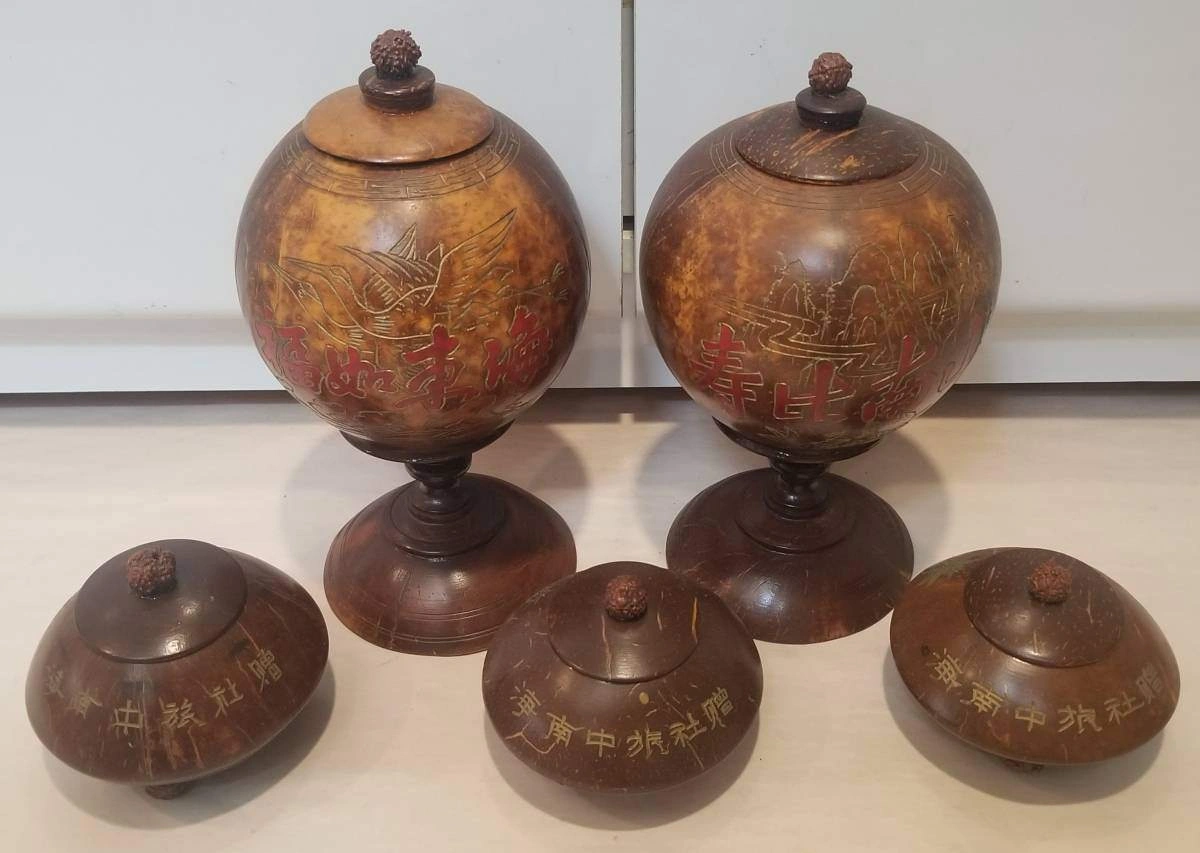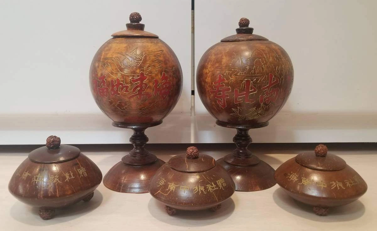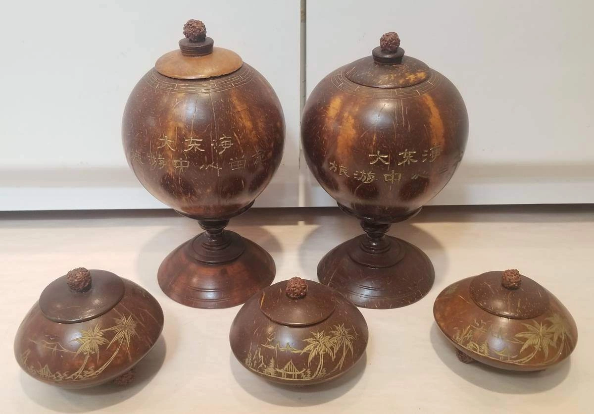 Vintage Carved Coconut Shell Urns & Bowls – Set of 5 E-Transfers Accepted Pick Up Anytime A unique vintage set of 5 hand-carved coconut shell containers, including 2 pedestal urns and 3 tripod footed bowls. Each piece features intricate hand-carved designs with Chinese characters, landscapes, pagodas, and palm trees, topped with natural seed knobs. Likely mid-20th century, made as decorative souvenir pieces from Asia. 2 Large Pedestal Urns: approx. 8.25" tall x 5" wide, carved with cranes and stylized Chinese characters. Turned wooden bases. 3 Smaller Tripod Bowls: approx. 3.25" tall x 4.75" wide, carved with pagodas and palm trees. Natural seed feet and knobs. All 5 pieces are in good vintage condition with age-appropriate wear. A full matching set like this is rare to find intact. Great for collectors of Asian art, vintage home décor, or unique handmade containers. asian décor, coconut shell carvings, Chinese export, hand-carved bowls, vintage urns, Asian antiques, retro décor, mid-century souvenirs, pedestal containers