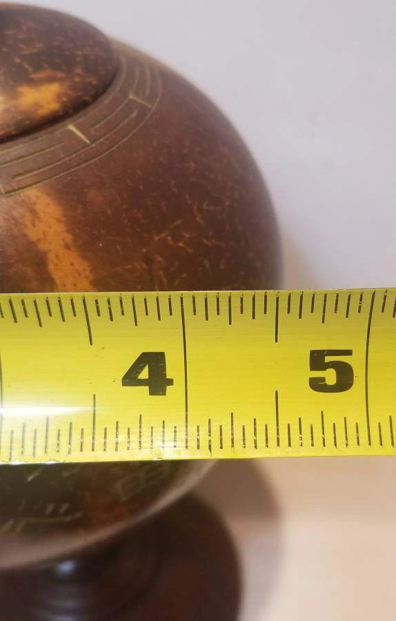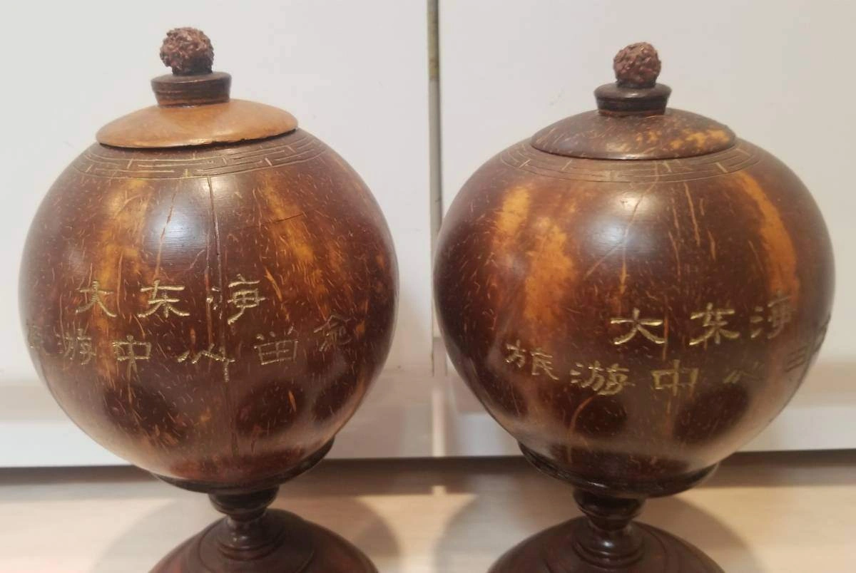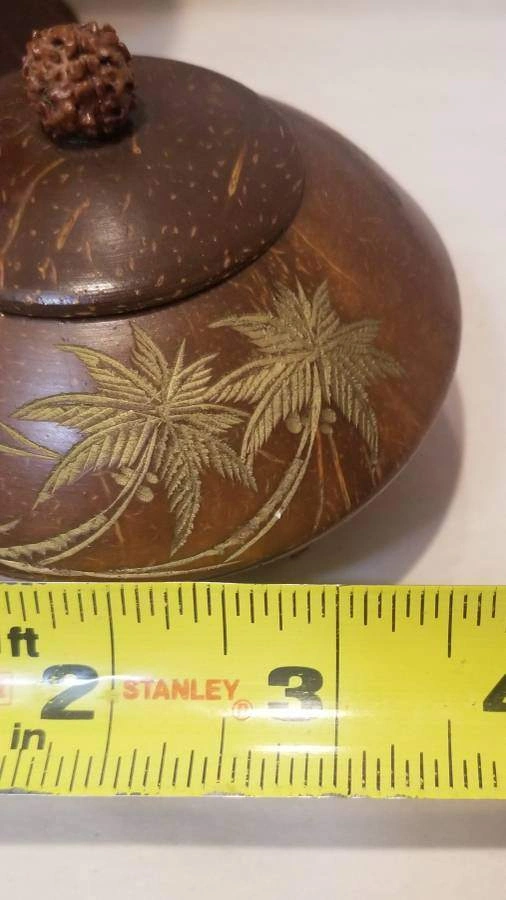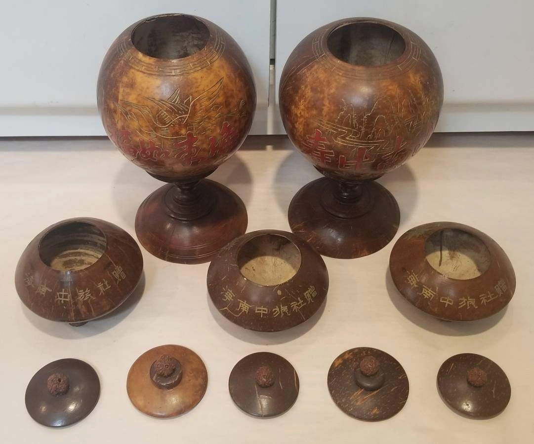 Vintage Carved Coconut Shell Urns & Bowls – Set of 5 E-Transfers Accepted Pick Up Anytime A unique vintage set of 5 hand-carved coconut shell containers, including 2 pedestal urns and 3 tripod footed bowls. Each piece features intricate hand-carved designs with Chinese characters, landscapes, pagodas, and palm trees, topped with natural seed knobs. Likely mid-20th century, made as decorative souvenir pieces from Asia. 2 Large Pedestal Urns: approx. 8.25" tall x 5" wide, carved with cranes and stylized Chinese characters. Turned wooden bases. 3 Smaller Tripod Bowls: approx. 3.25" tall x 4.75" wide, carved with pagodas and palm trees. Natural seed feet and knobs. All 5 pieces are in good vintage condition with age-appropriate wear. A full matching set like this is rare to find intact. Great for collectors of Asian art, vintage home décor, or unique handmade containers. asian décor, coconut shell carvings, Chinese export, hand-carved bowls, vintage urns, Asian antiques, retro décor, mid-century souvenirs, pedestal containers