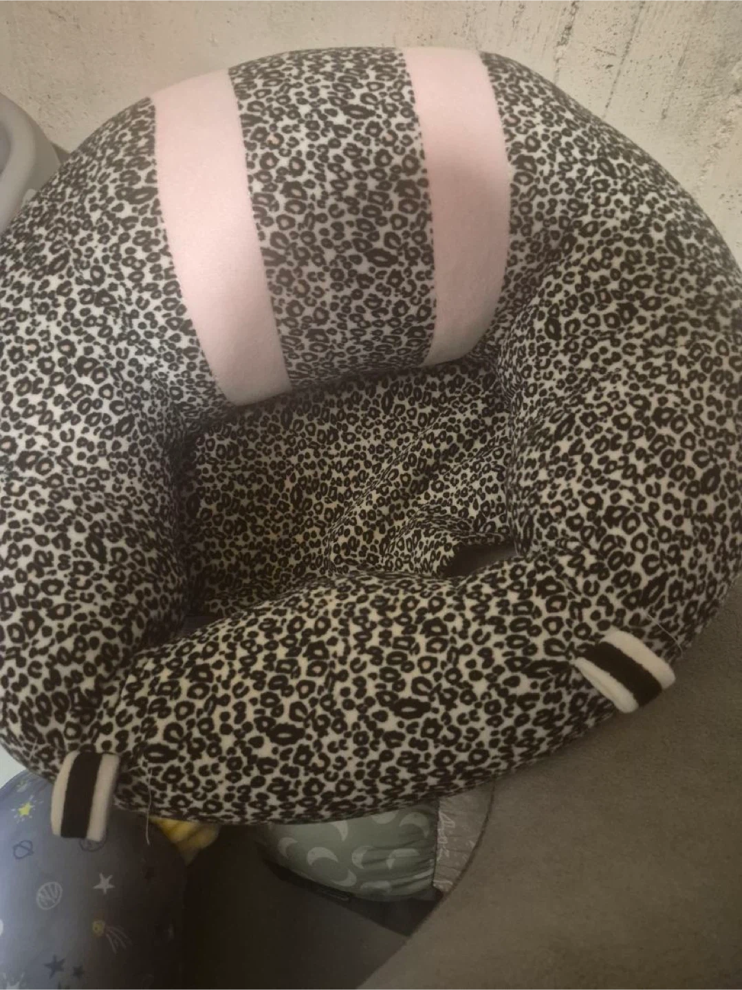 Selling a gently used infant support seat. Features a fun leopard print design with pink accents. Perfect for helping your little one sit up and explore their surroundings!