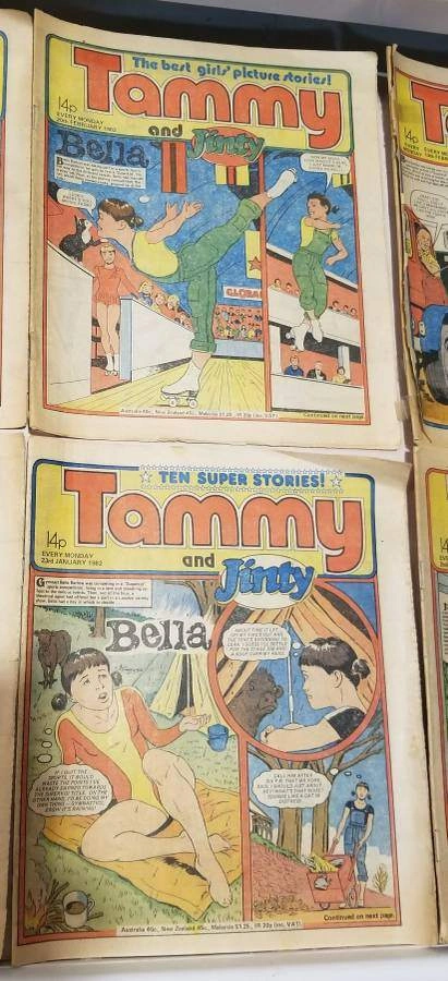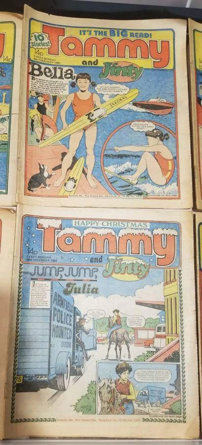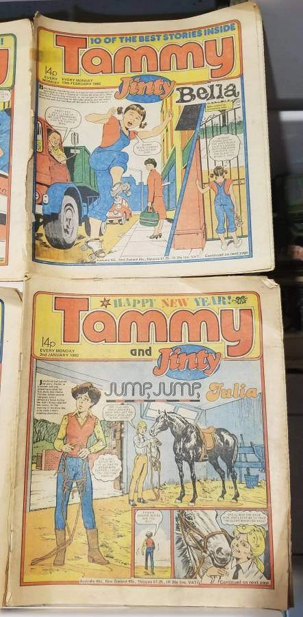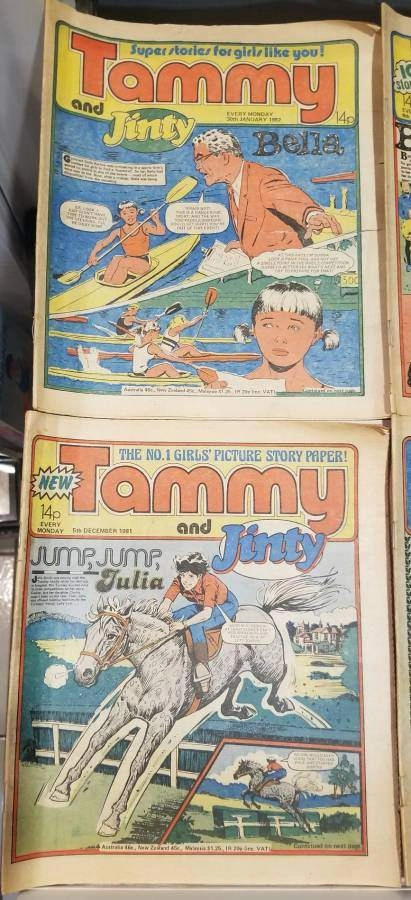 Vintage Tammy & Jinty British Girls’ Comics – 8 Issues (1981–1982) E-Transfers Accepted Pick Up Anytime Lot of 8 original Tammy and Jinty weekly comics from 1981–1982, published by IPC Magazines in the UK. These issues feature classic picture stories for girls including Bella and Jump, Jump, Julia. Covers include Christmas and New Year specials, making this a nostalgic set for collectors. All in fair to good vintage condition with bright covers and complete interiors. Great addition for vintage British comic collectors or fans of 1980s girls’ story papers. Tammy comics Jinty comics Bella story Vintage British comics Fleetway IPC magazines 1980s girls comics