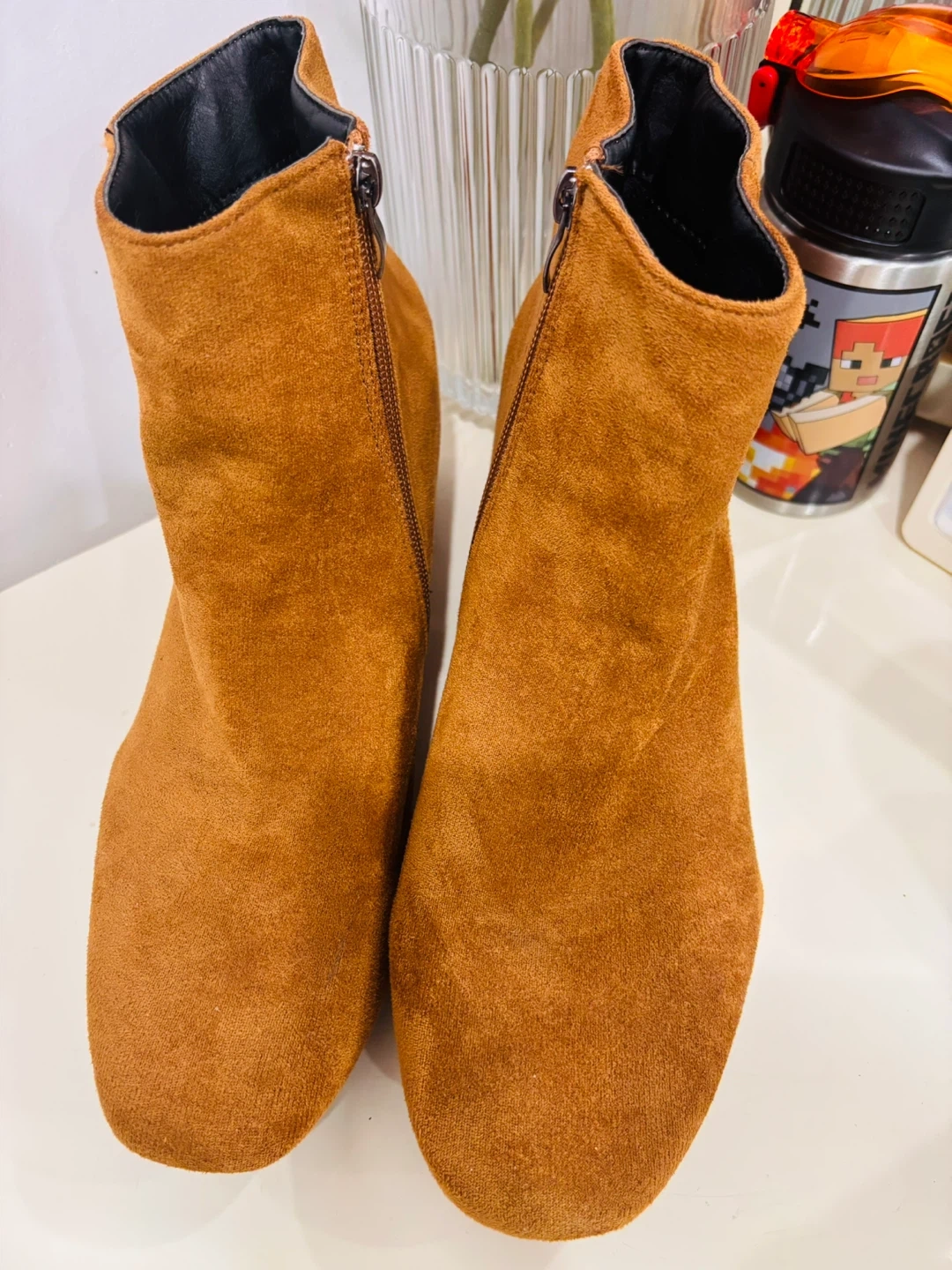 Selling a pair of stylish brown ankle boots. They feature a suede-like material and a convenient side zipper for easy wear. Perfect for adding a touch of warmth and sophistication to your outfit!