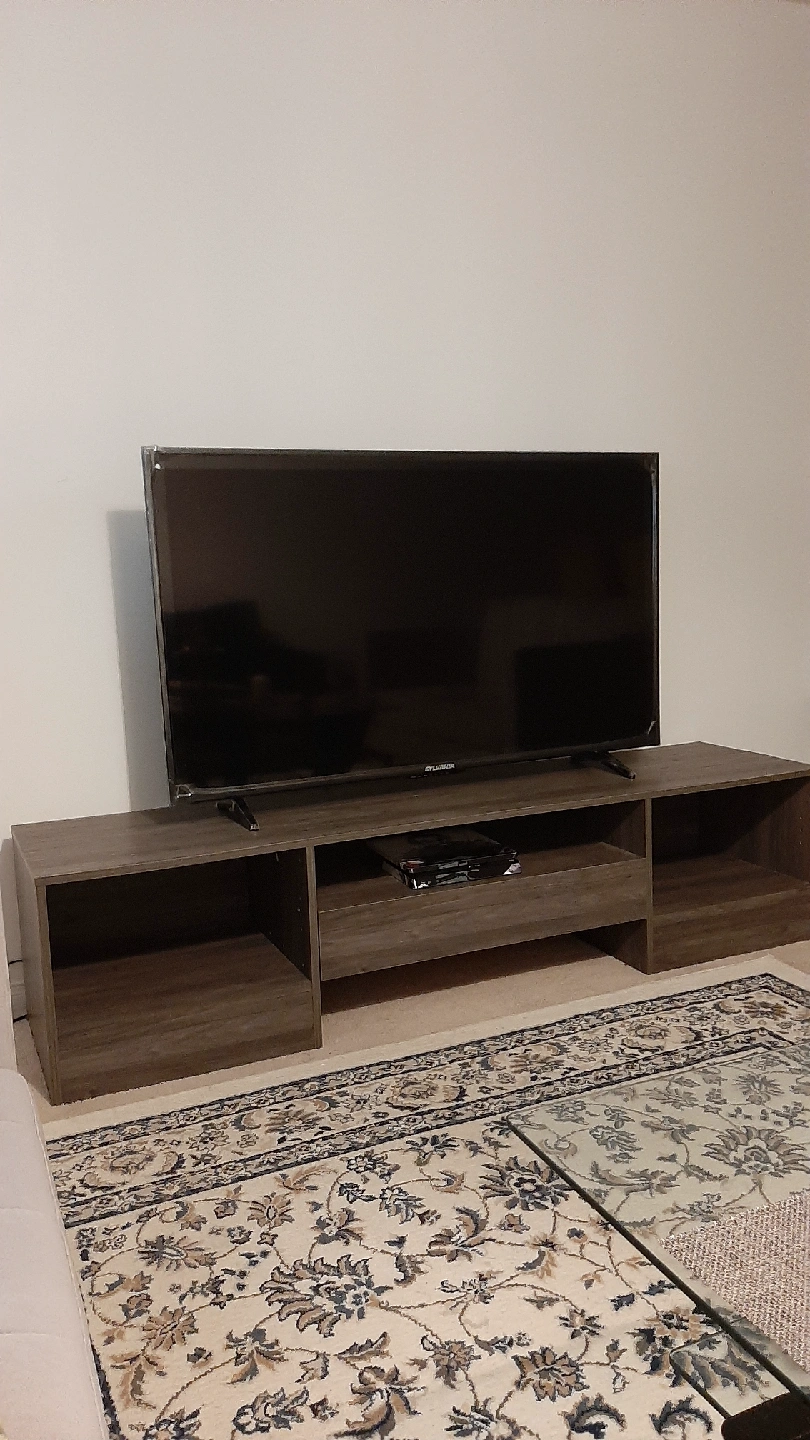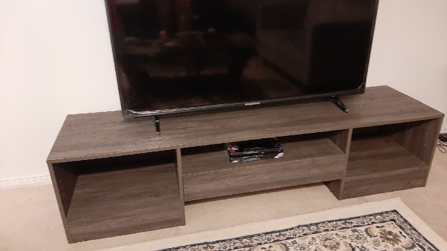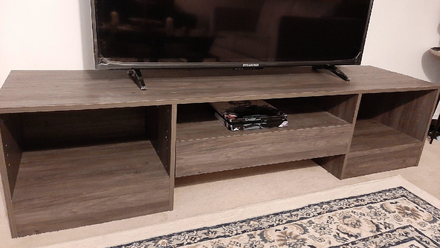 Selling a TV stand with a bark grey laminate finish. It fits a TV screen up to 80-inches. There is one wide storage drawer in the center, mounted on metal slides.