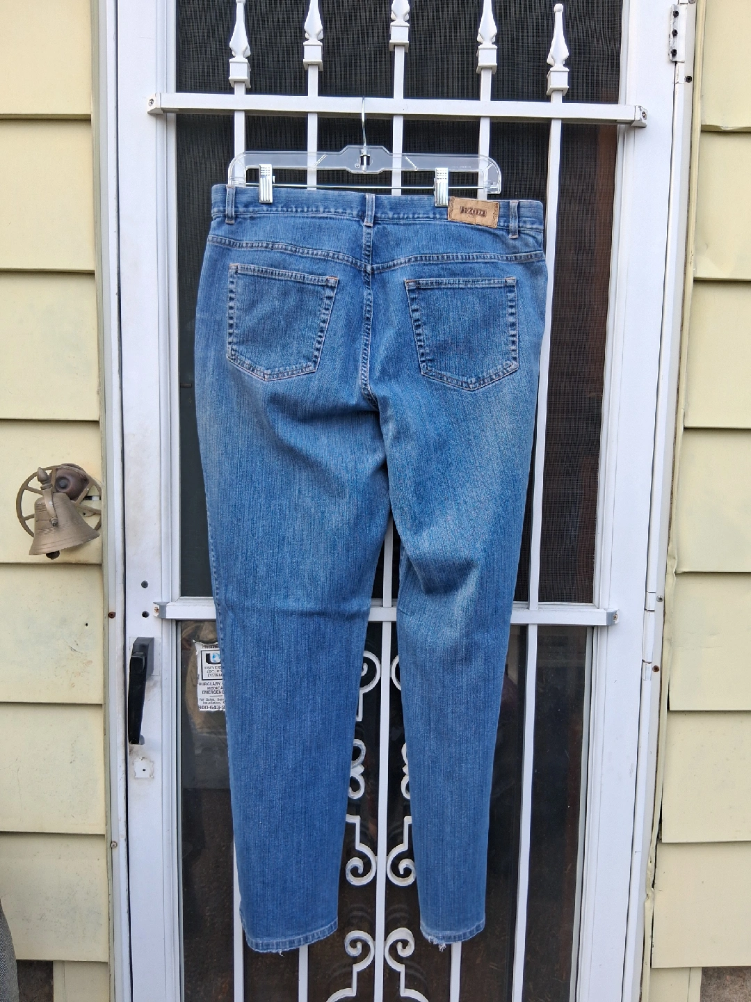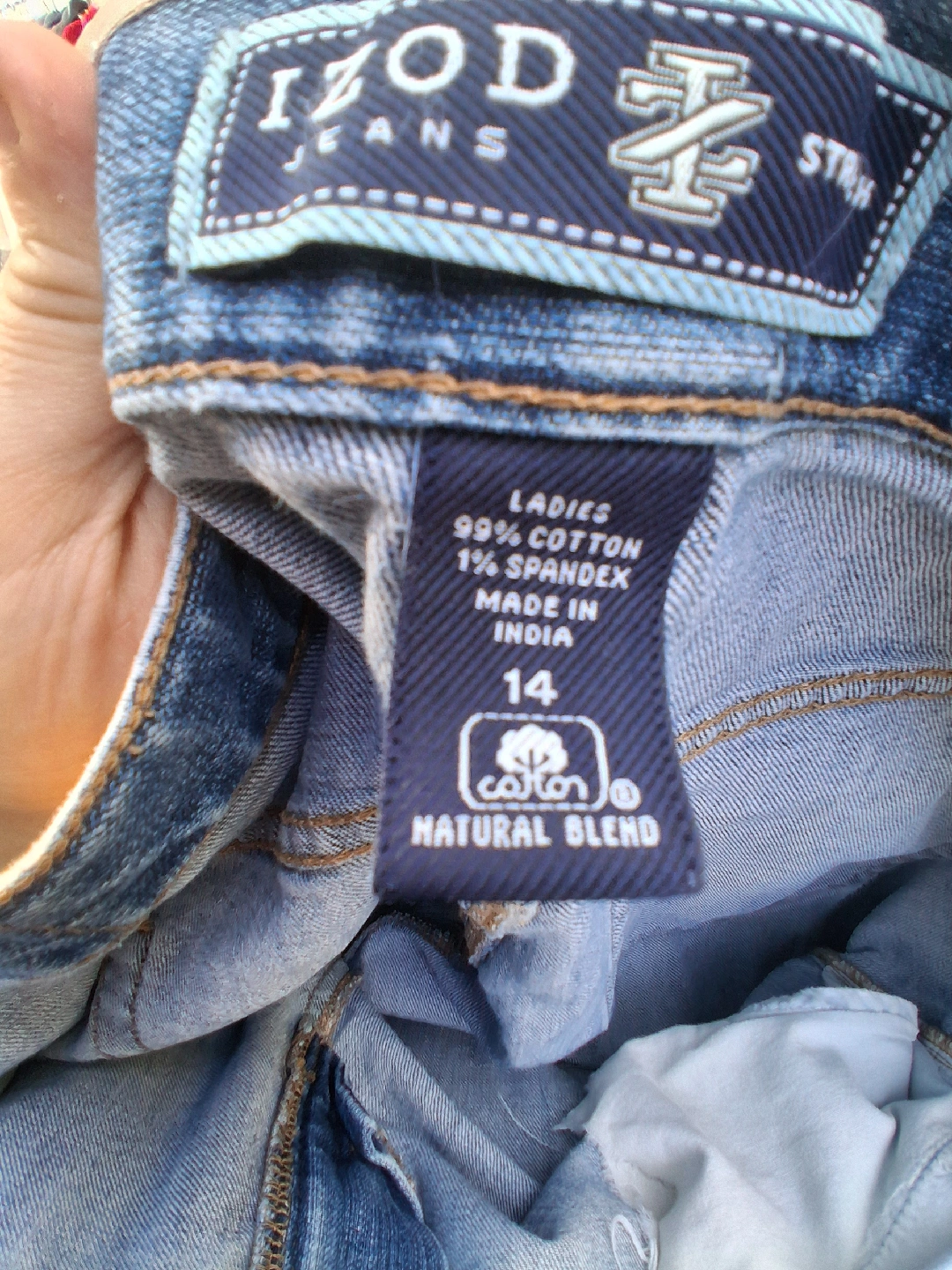 Selling a pair of IZOD jeans in women's size 14. They are made of 99% cotton and 1% spandex, offering a comfortable natural blend. These jeans are in good condition and ready for a new home