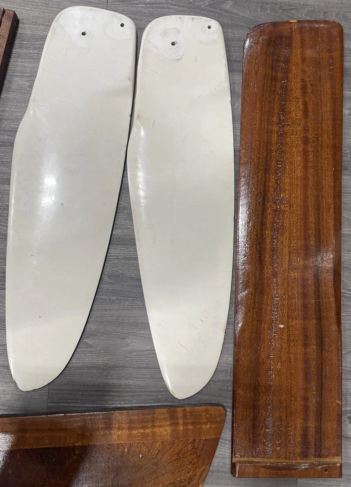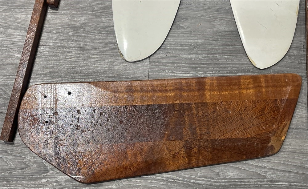 Vintage Mahogany & Fiberglass Rudders – Set of 4 E-Transfers Accepted Pick Up Anytime A rare opportunity for both boating enthusiasts and decorative collectors—this set of four large rudders includes two handcrafted mahogany pieces and two durable fiberglass pieces. Whether you’re planning a restoration project, need functional spares, or want statement nautical décor, this collection offers versatility and character. Details & Approximate Age: 2 × Solid Mahogany Rudders – classic marine-grade wood with rich grain, approx. 32" × 12" (81 × 30 cm). Era: Mid-20th century to 1970s (hand-laminated, varnished finish). 2 × Fiberglass Rudders – lightweight, molded construction, approx. 30" × 10" (76 × 25 cm). Era: 1970s–1990s (common on production dinghies/day-sailers). Condition: Vintage; some cosmetic wear consistent with age and service. All four are structurally solid. Wood shows rich patina, fiberglass has light scuffs—authentic character throughout. Why They’re Special: Functional Use: Excellent as spares or components for small sailboat restorations. Collector Appeal: Striking as nautical wall décor, retail displays, or repurposed into furniture and art. Versatile Mix: Warm hand-made wood + practical fiberglass covers both tradition and durability. Pricing Options: Mahogany Rudders – $125 CAD each Fiberglass Rudders – $90 CAD each All 4 together – $325 CAD (discounted group price) nautical, marine, rudder, centerboard, sailboat, boat parts, mahogany, fiberglass, restoration, maritime, vintage, décor, collector Price: $90–325 CAD