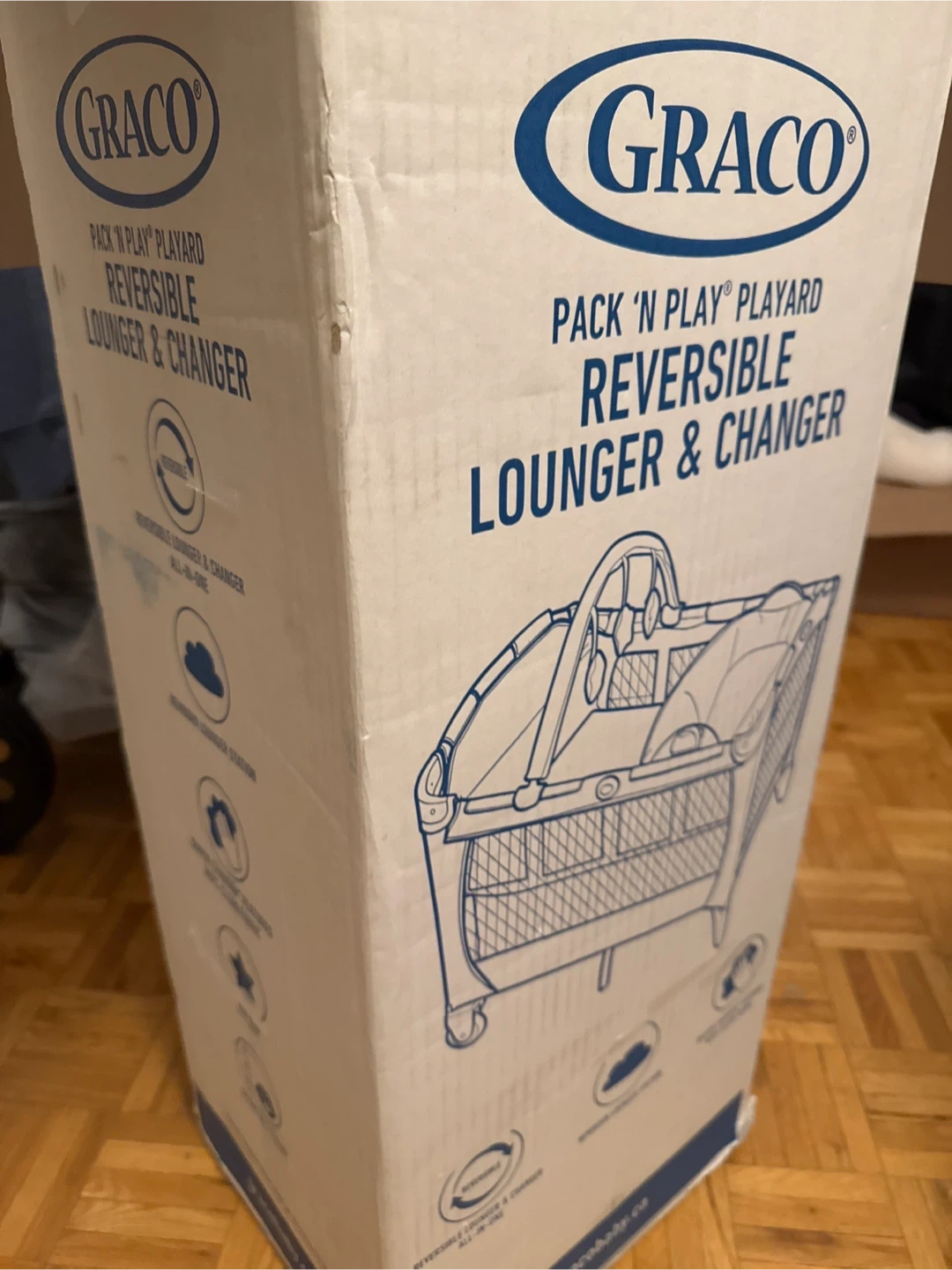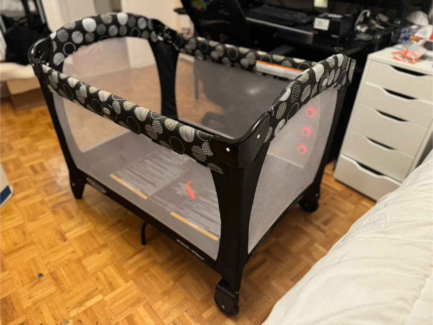 Selling a Graco Pack 'n Play playard! It's in great condition and perfect for little ones. The black and white pattern is stylish and will fit into any room. It's easy to set up and take down, making it great for travel or storage. A safe and comfy space for your baby to play or nap. Top accessories are not included - lowered price. You can negotiate.