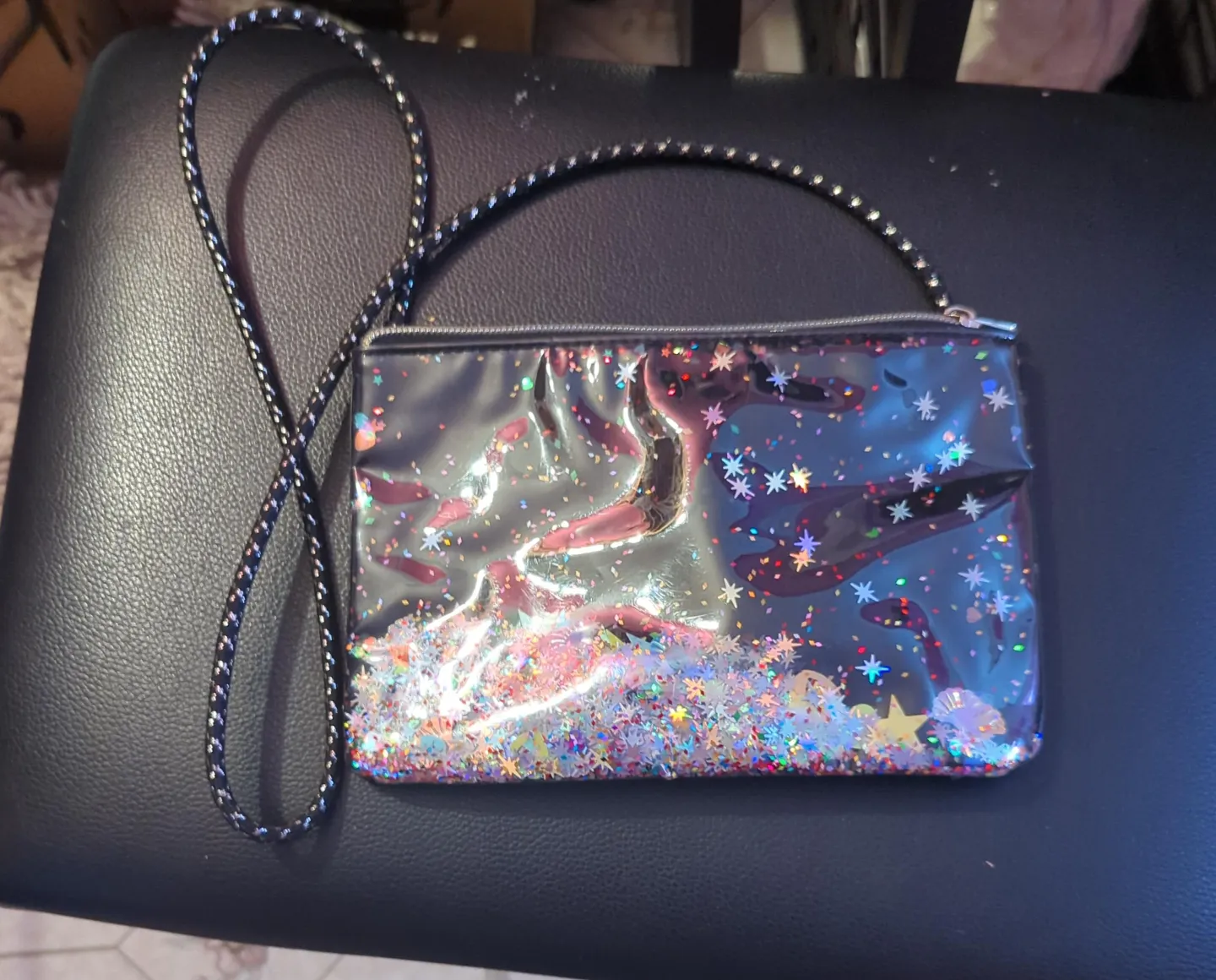 Cute glittery black crossbody bag! It has a fun design with stars and glitter inside the clear material. Perfect for adding a touch of sparkle to any outfit