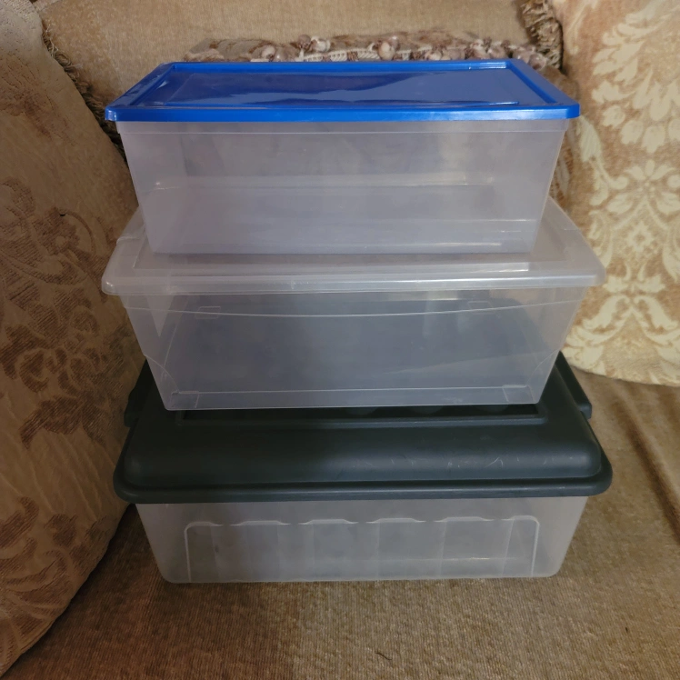 Selling a set of three plastic storage bins. They're in good condition and perfect for organizing your space. The set includes a bin with a blue lid, one with a clear lid, and a darker bin with a grey lid. Great for storing clothes, toys, or household items