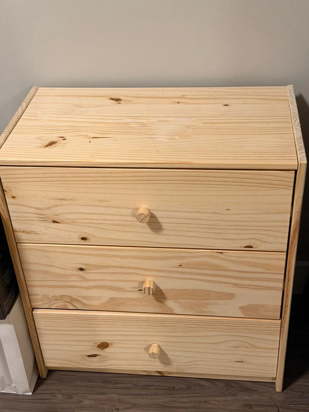 Selling a wooden dresser with three drawers. It's in great shape and perfect for adding some extra storage to your bedroom or any other space in your home. The natural wood finish would fit in with any decor!