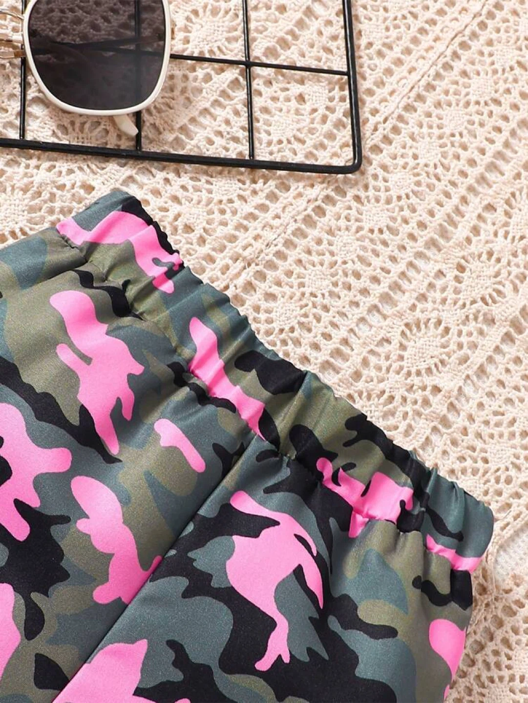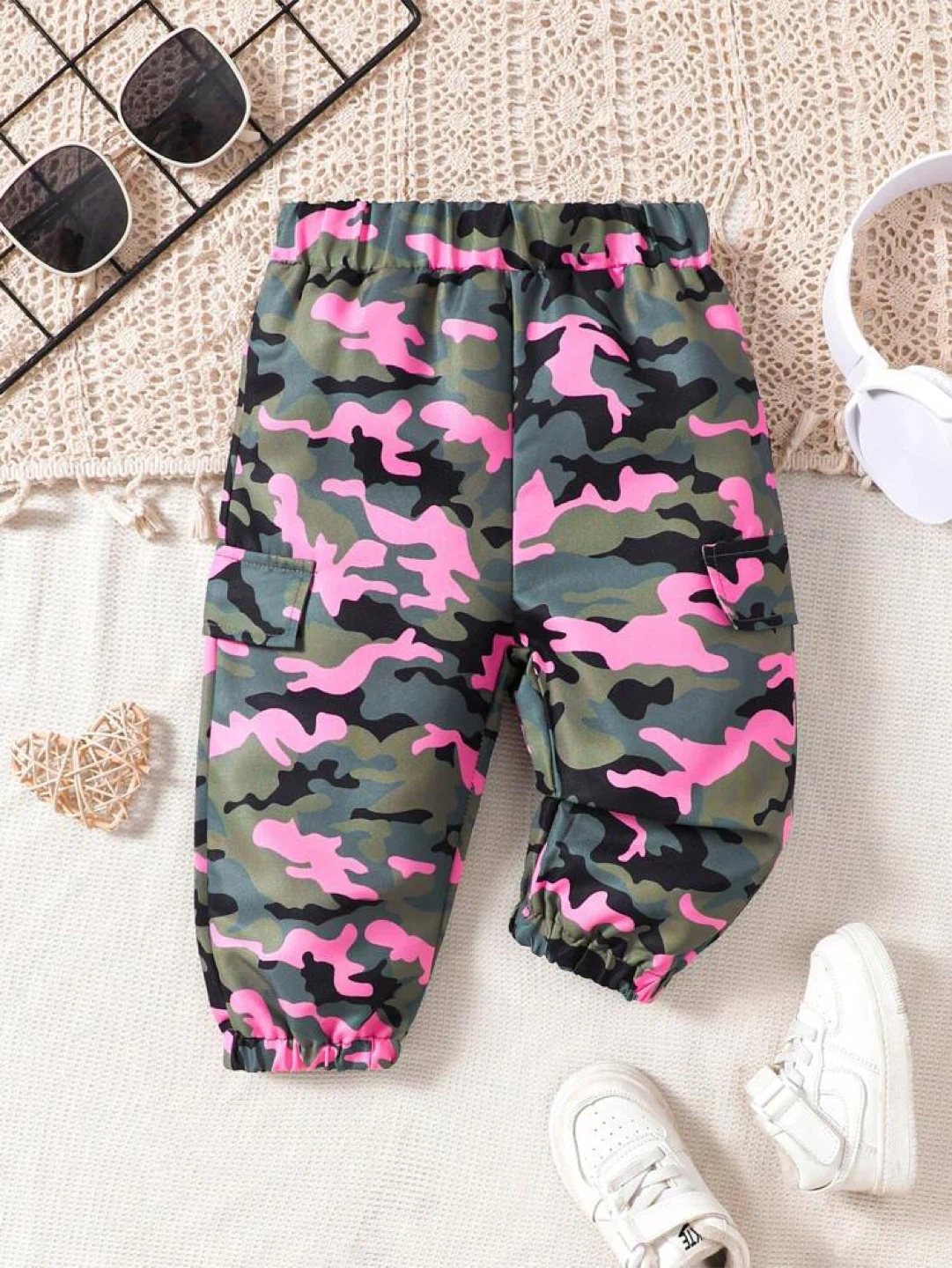 Selling a cute little set for kids! It includes a pair of camo pants and a bright pink t-shirt with 'KEEP SMILE' and the number 86 on it. Perfect for playdates or casual wear