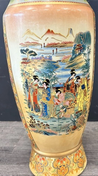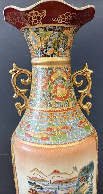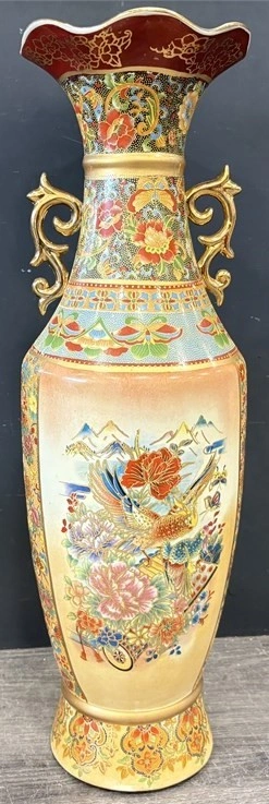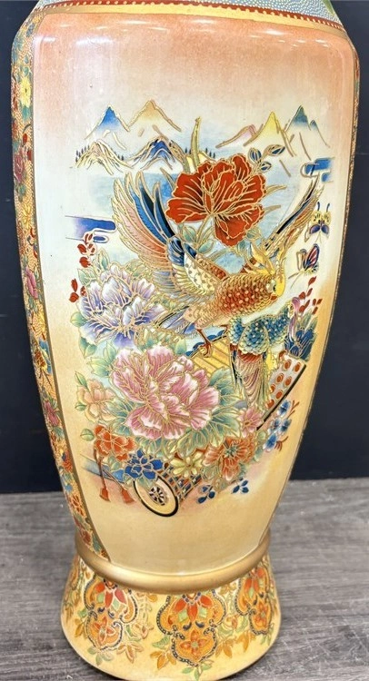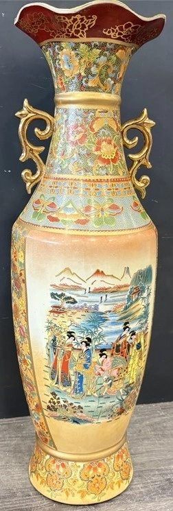 ANTIQUE JAPANESE SATSUMA STYLE FLOOR VASE – 24” TALL E-Transfers Accepted Pick Up Anytime A stunning 24” tall antique Japanese Satsuma-style floor vase, richly decorated with gilded floral panels, raised moriage enamel, and elaborate hand-painted scenes. One side features a majestic phoenix surrounded by vibrant peonies, while the reverse depicts a detailed gathering of geisha against a mountain landscape. The twin scrolled handles and flared rim add an extra touch of elegance, making this vase both a decorative statement and a collector’s showcase piece. Estimated production: early 20th century (c. 1920s–1940s), made for export in the traditional Satsuma style. Its large size, ornate gilding, and fine artistry place it above common tourist pieces, making it a true premium display vase. Perfect for collectors of Japanese art, Asian antiques, or those looking to elevate an interior with a striking cultural artifact. star wars vase oriental satsuma moriage phoenix geisha export ware floor vase japanese chinese asian decor antique collectible gilded enamel $250 CAD