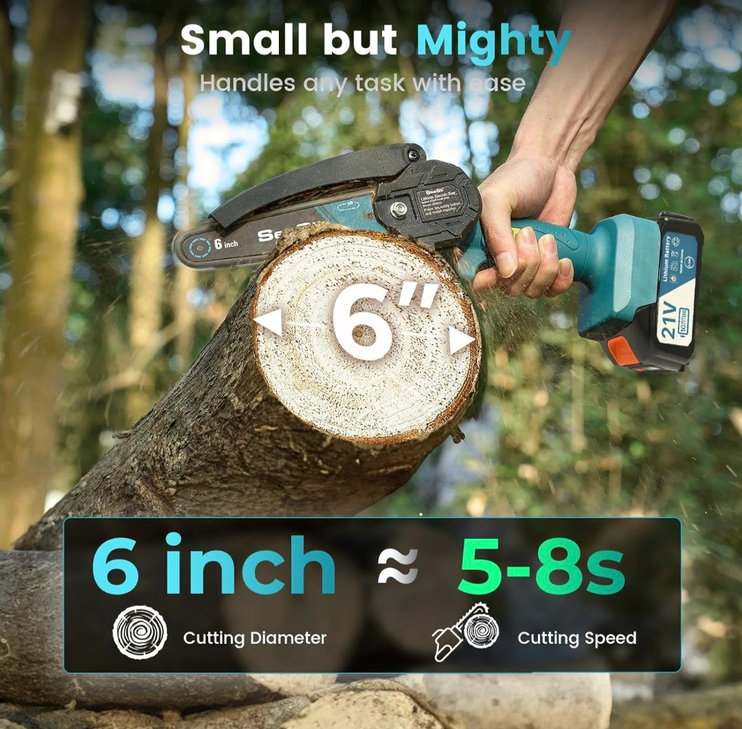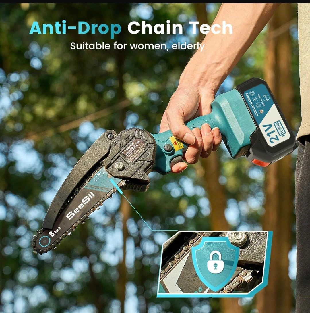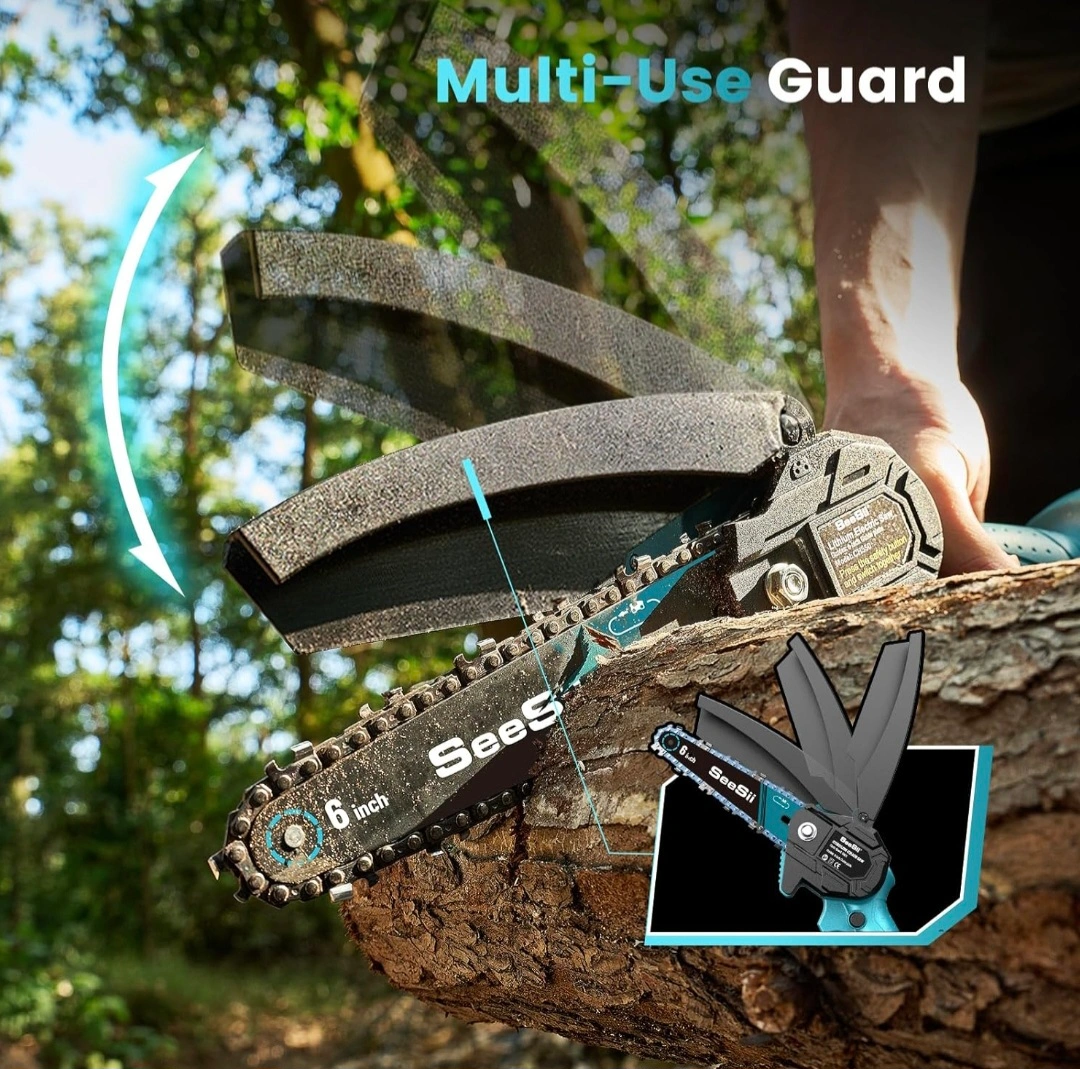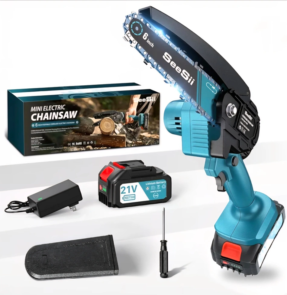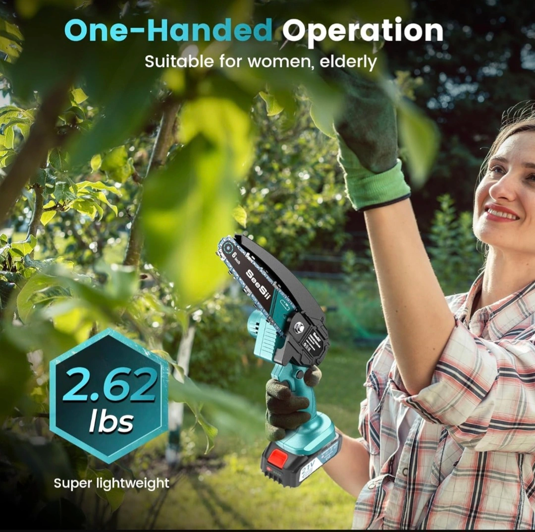 I'm selling a SeeSii mini electric chainsaw! It's a portable cordless chainsaw with a 6-inch blade. It comes with a 21V lithium battery and charger. It's super lightweight at only 2.62 lbs, and perfect for one-handed operation. The multi-use guard adds extra safety. It's designed to be small but mighty, handling tasks with ease! -Open Box -Model: 4C10S
