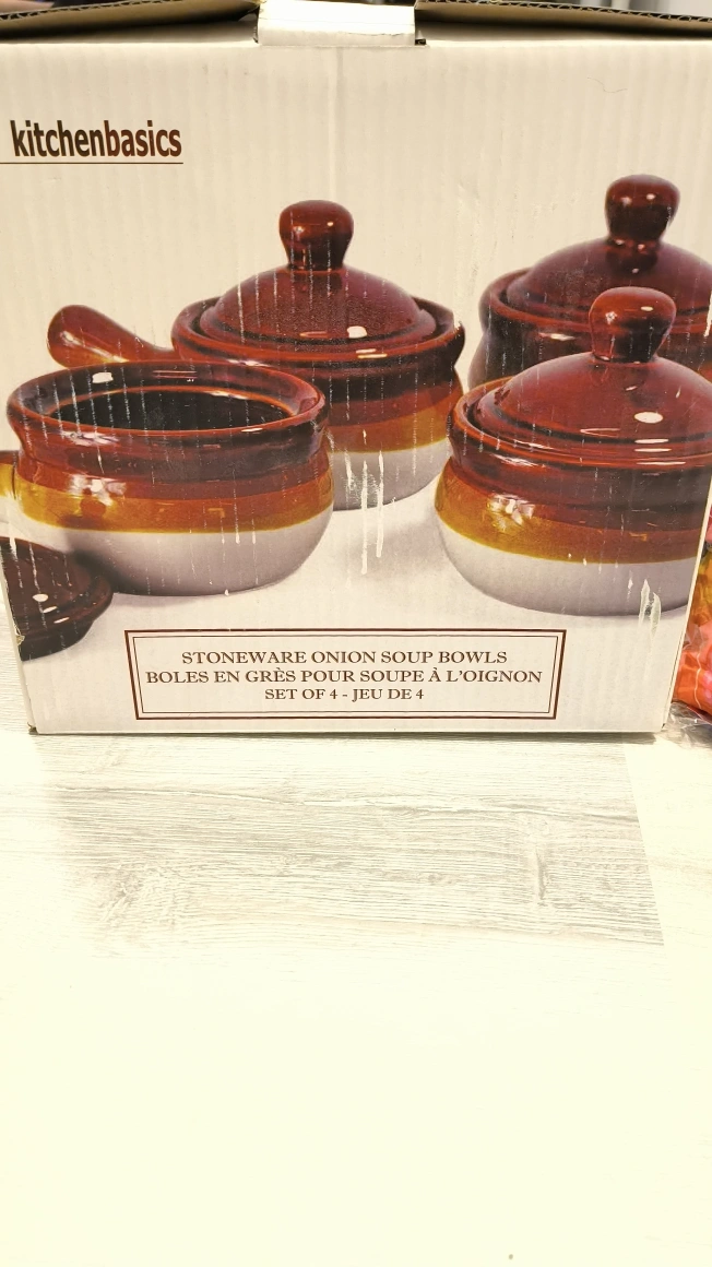 Selling a set of 4 stoneware french onion soup bowls from Kitchen Basics. These are brand new and come in their original box. These bowls are perfect for serving up a warm and delicious bowl of french onion soup on a chilly day!