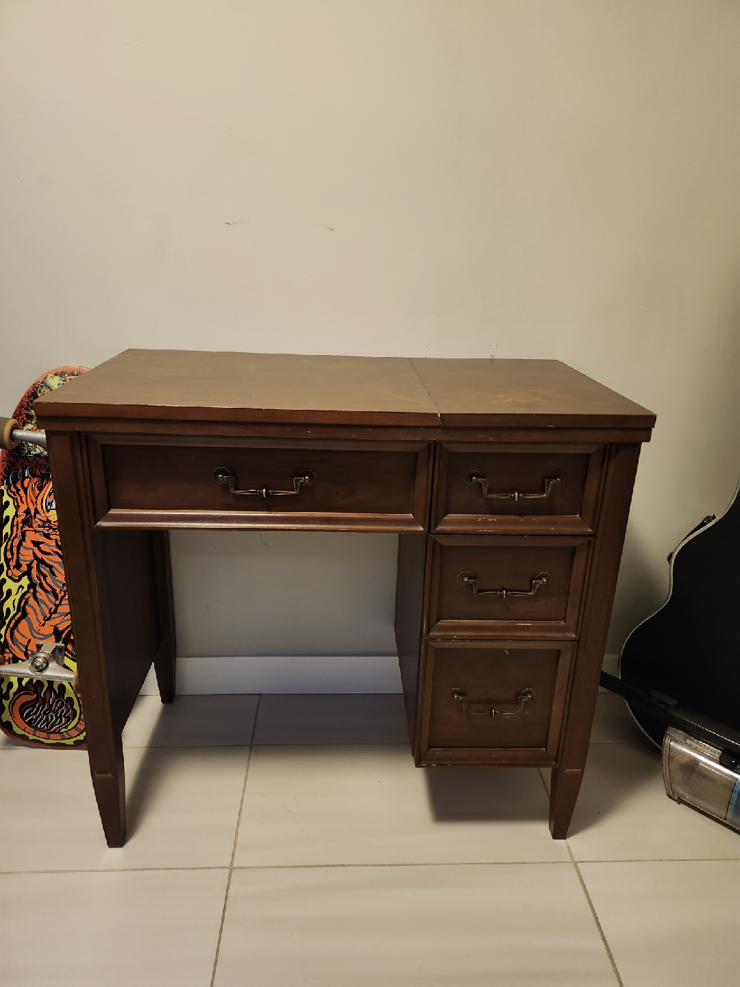 Charming vintage wood desk in a dark brown finish! It features several smaller drawers for storage. Perfect for a home office or study space. It has some signs of wear, but it adds to its character