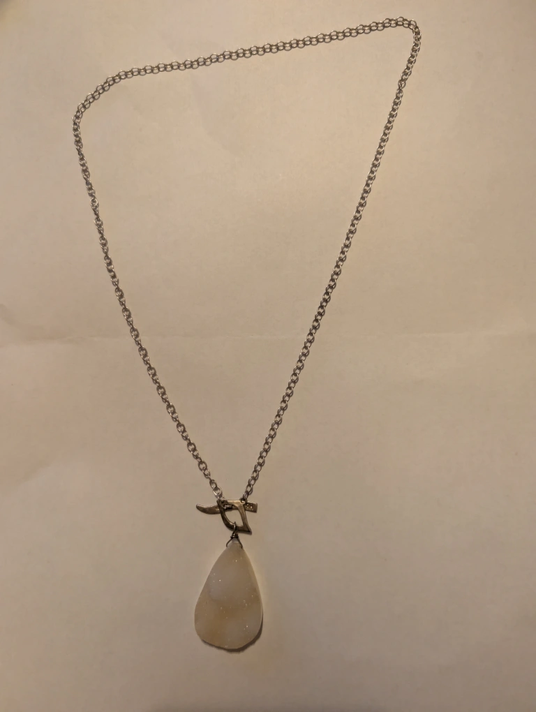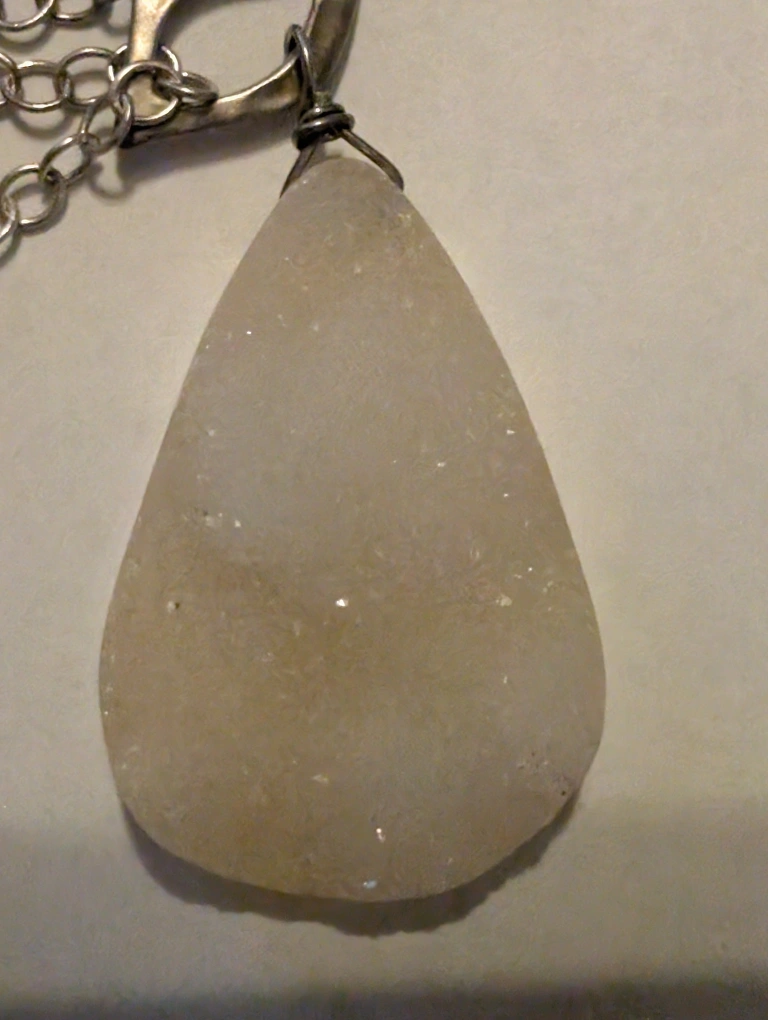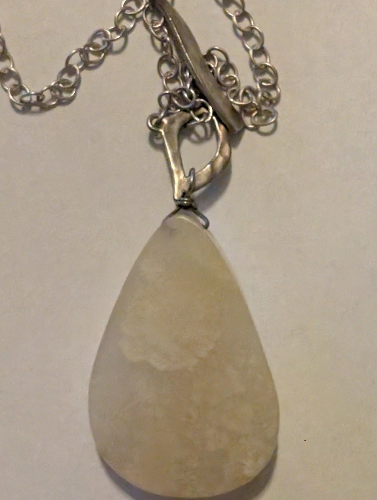Selling a beautiful vintage silver chain necklace featuring a unique quartz crystal teardrop pendant. The clasp is marked with '925', indicating the silver quality. It's in great condition and ready to add a touch of elegance to any outfit!