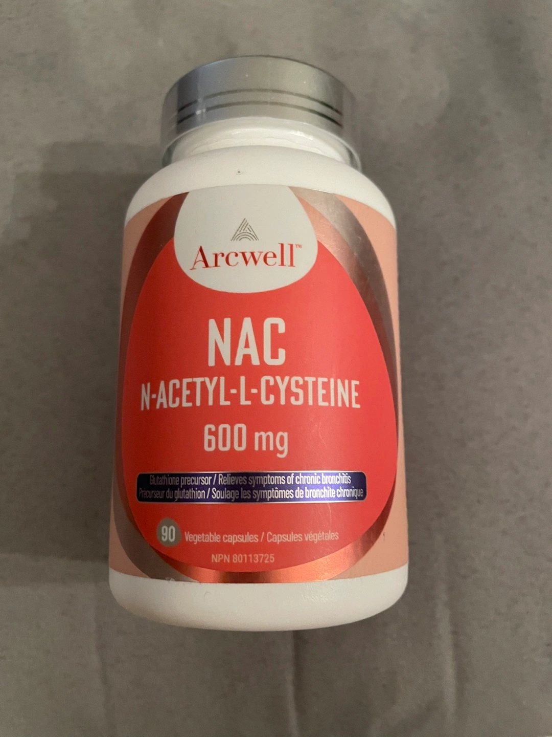 Full bottle of Arcwell NAC (N-Acetyl-L-Cysteine) 600mg capsules. It contains 90 vegetable capsules. This supplement is a source of antioxidants and helps relieve symptoms of chronic bronchitis.
