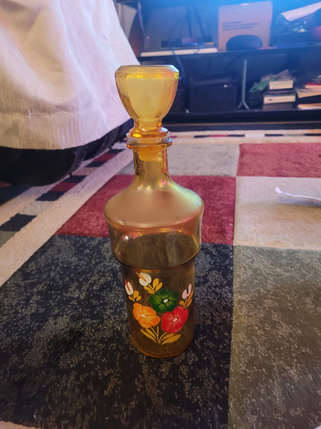 Selling a vintage glass decanter with a beautiful floral design. It has a lovely amber hue and comes with a matching stopper. Perfect for adding a touch of retro charm to your home!
