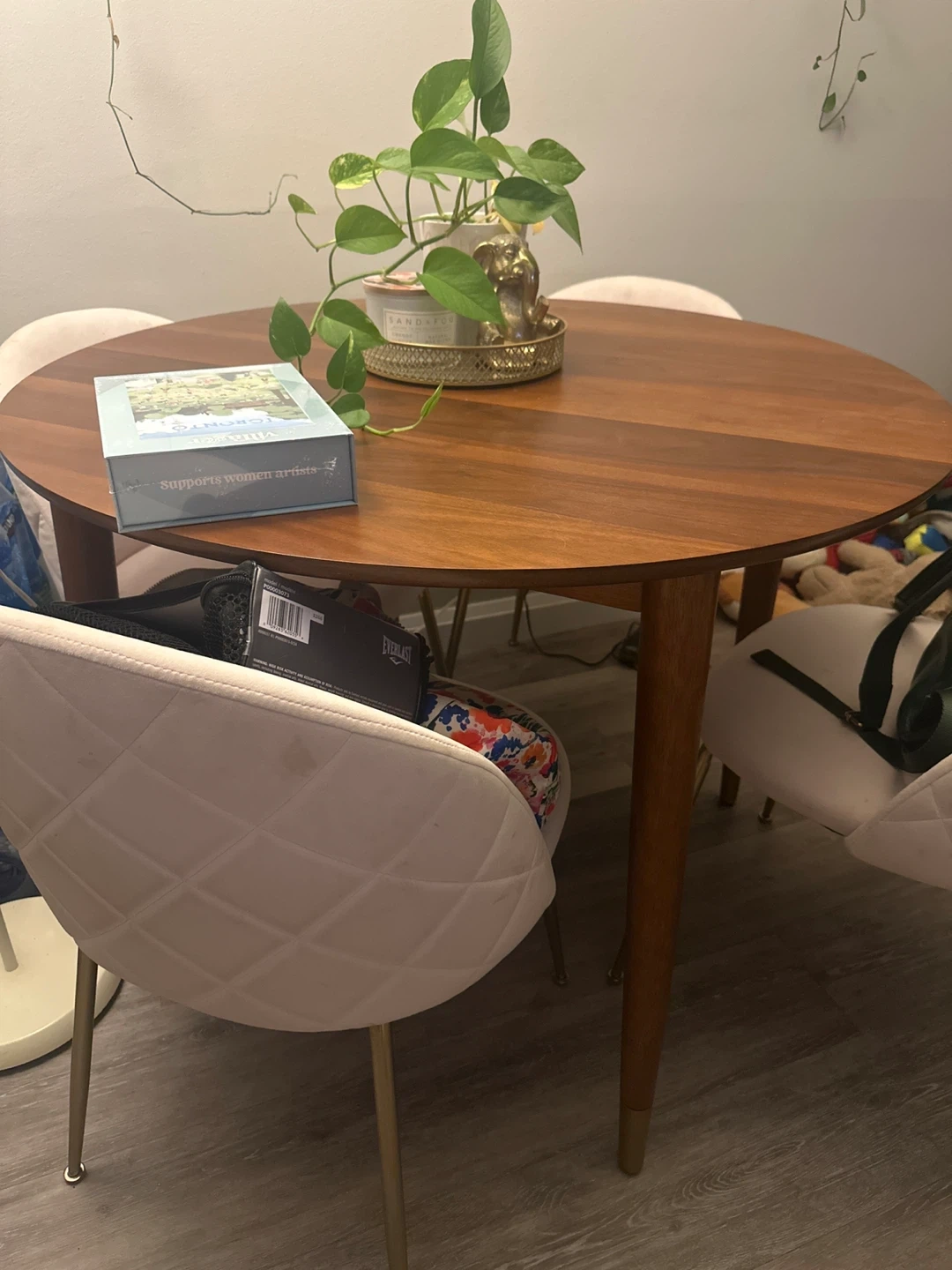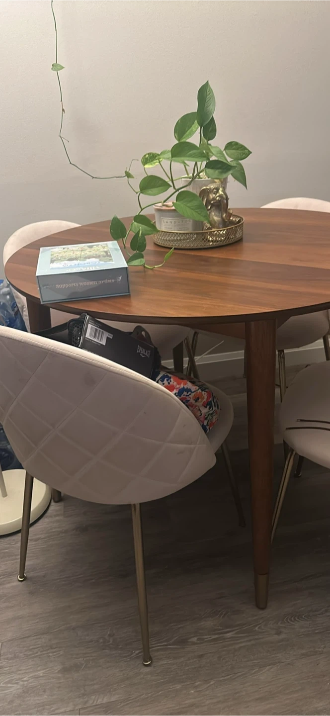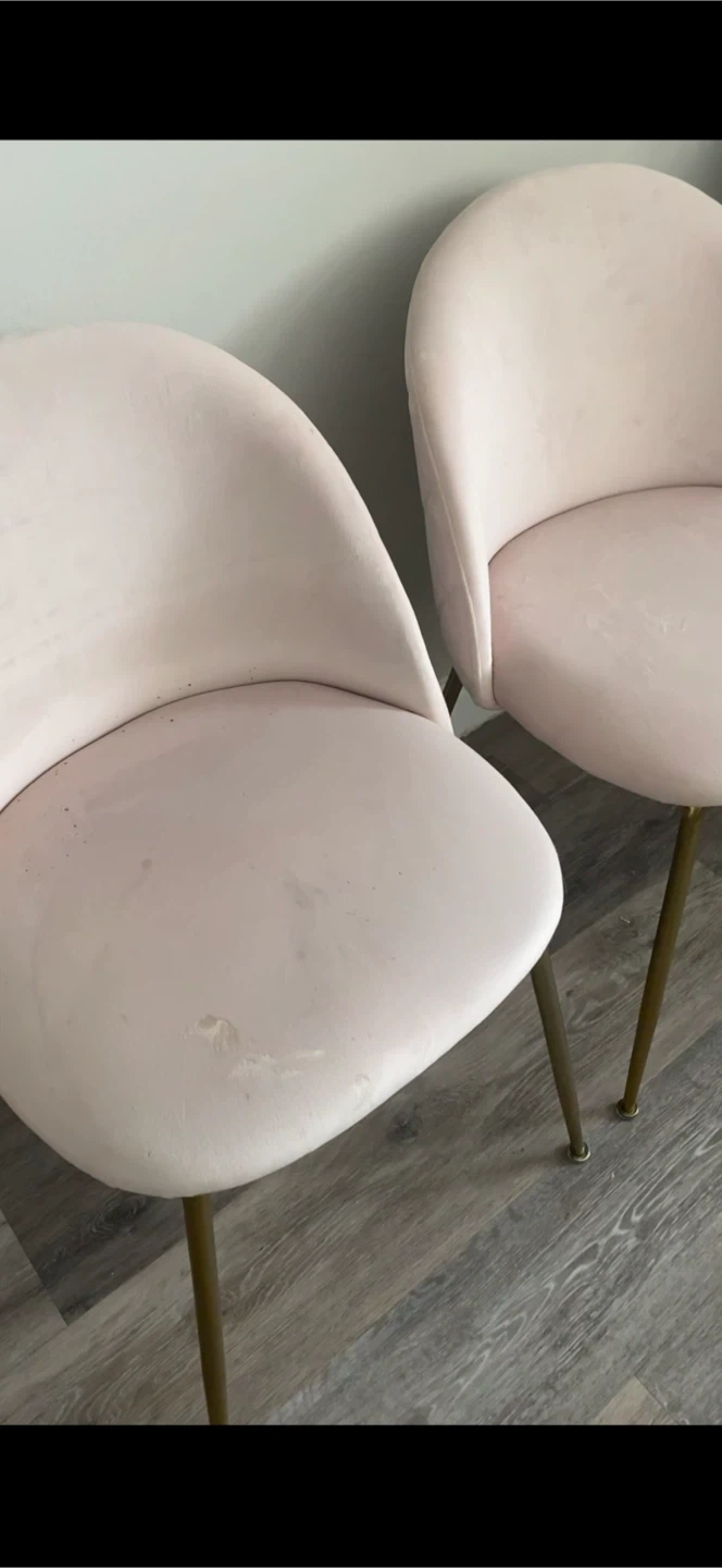 Selling a Structube set of 100cm dining table with 4 Polly velvet dining chair in light pink. It's got a stylish, modern look with gold-tone legs. There are some signs of wear on the seat, but it can be cleaned, and it will be cute addition to any dining space! Originally priced at $119, each chair, and $279 the table. Send your considerate offer! Pick up at 88 Erskine ave.