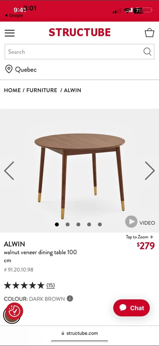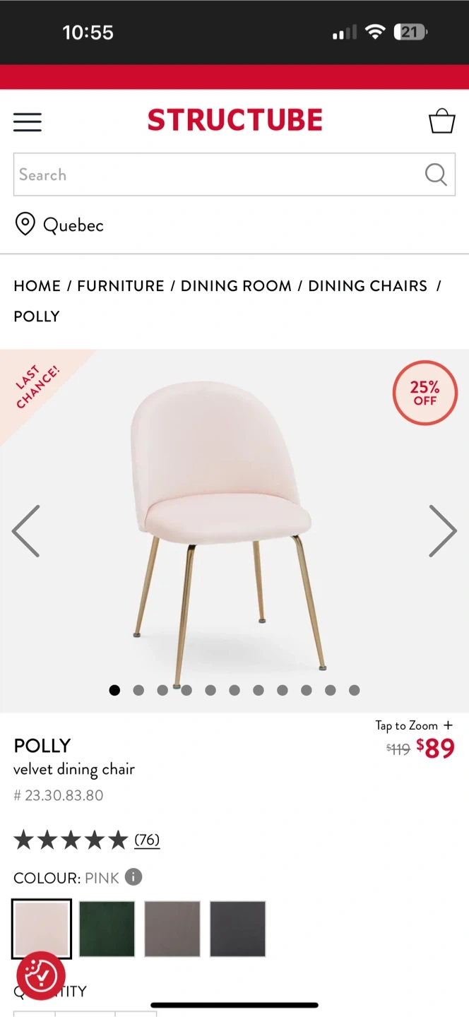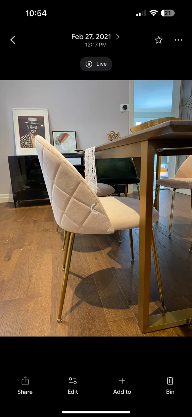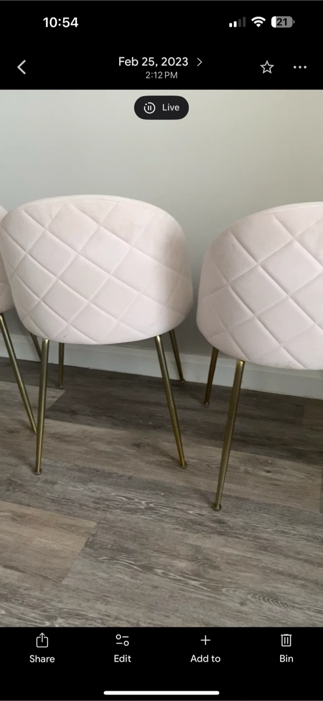 Selling a Structube set of 100cm dining table with 4 Polly velvet dining chair in light pink. It's got a stylish, modern look with gold-tone legs. There are some signs of wear on the seat, but it can be cleaned, and it will be cute addition to any dining space! Originally priced at $119, each chair, and $279 the table. Send your considerate offer! Pick up at 88 Erskine ave.