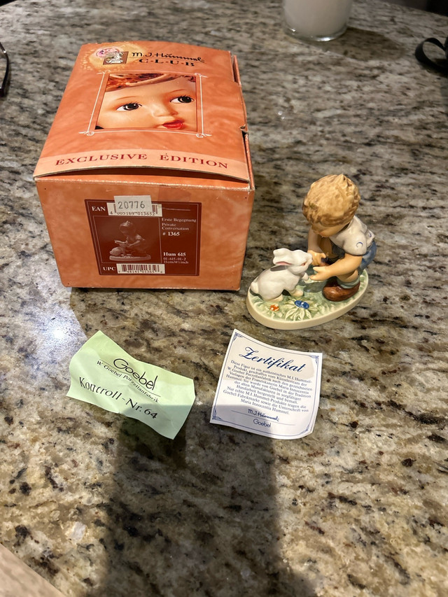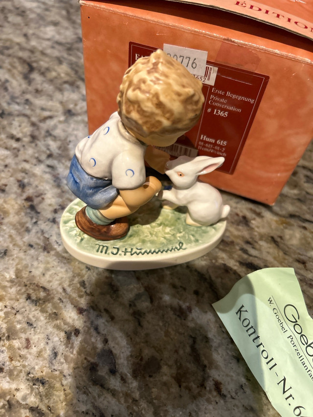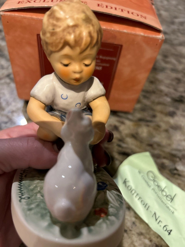 This Goebel Hummel figurine, depicting a boy with a bunny, is a delightful collectible in good condition. It comes with the original box and papers. This piece would make a charming addition to any Hummel collection, showcasing the classic artistry and heartwarming themes that Goebel is known for. The box is showing wear and tear but the figurine is in perfect condition, it has never left the box. Let me know if you're interested!