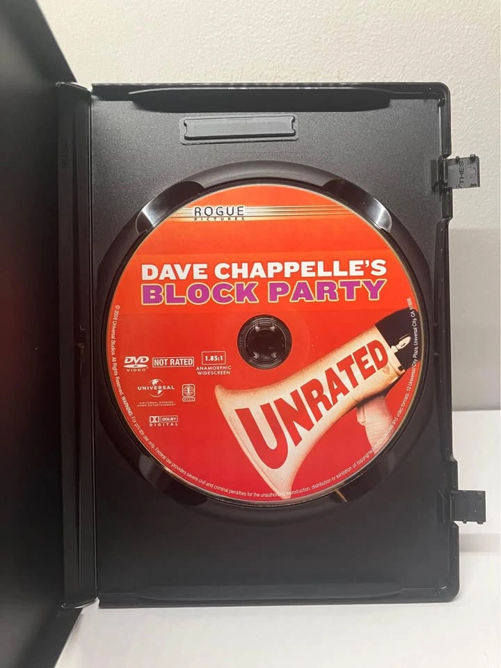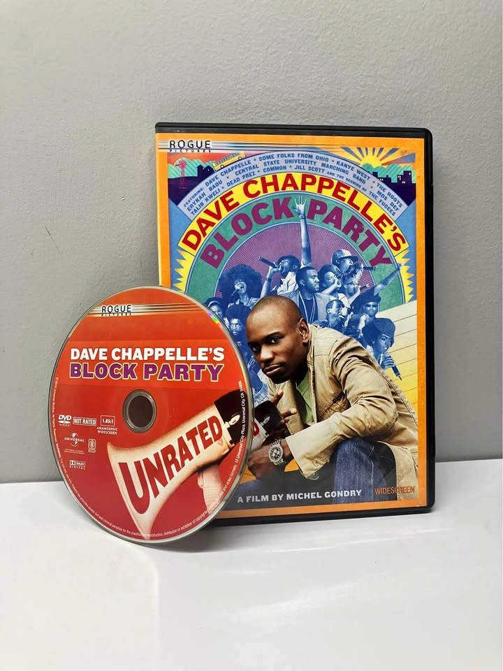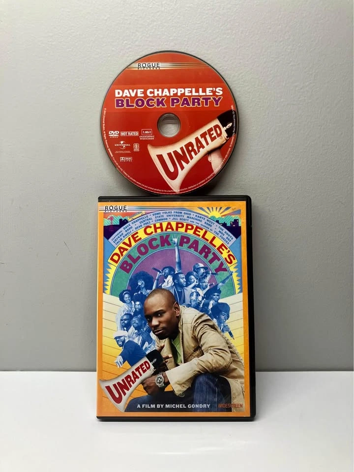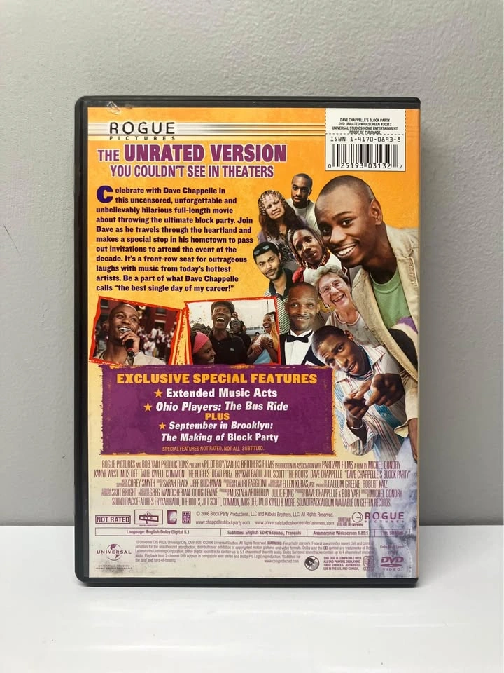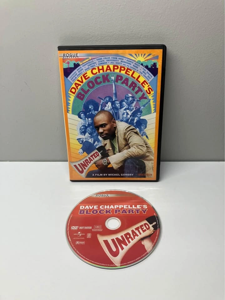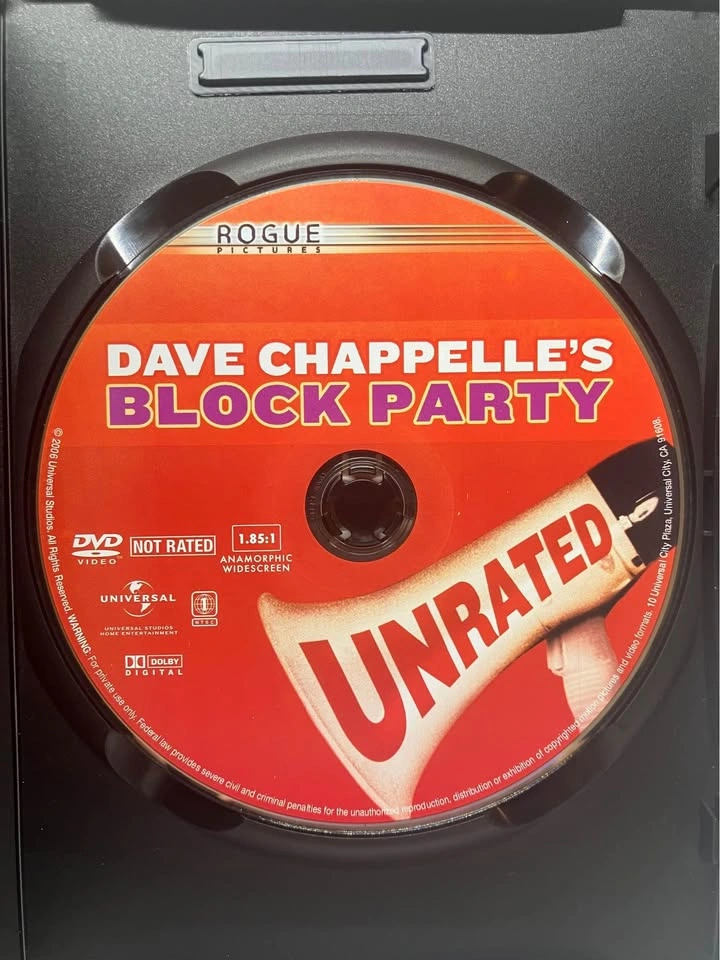 Celebrate with Dave Chappelle in the uncensored, unforgettable and unbelievably hilarious full-length movie about throwing the ultimate block party. Join Dave as he travels through the heartland and makes a special stop in his hometown to pass out invitations to attend the event of the decade. It's a front-row seat for outrageous laughs with music from today's hottest artists. Be a part of what Dave Chappelle calls "the best single day of my career!" Bonus Content: Extended Music Acts September in Brooklyn: The Making of Block Party Ohio Players: The Bus Ride Dave Chappelle's Block Party Soundtrack From a smoke and pet free home. Check out in person before purchasing. Thanks for looking.