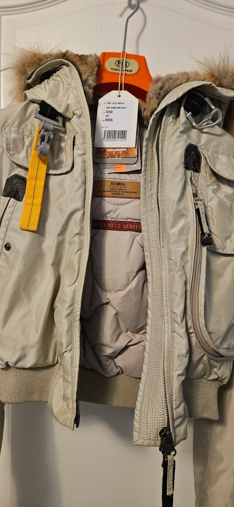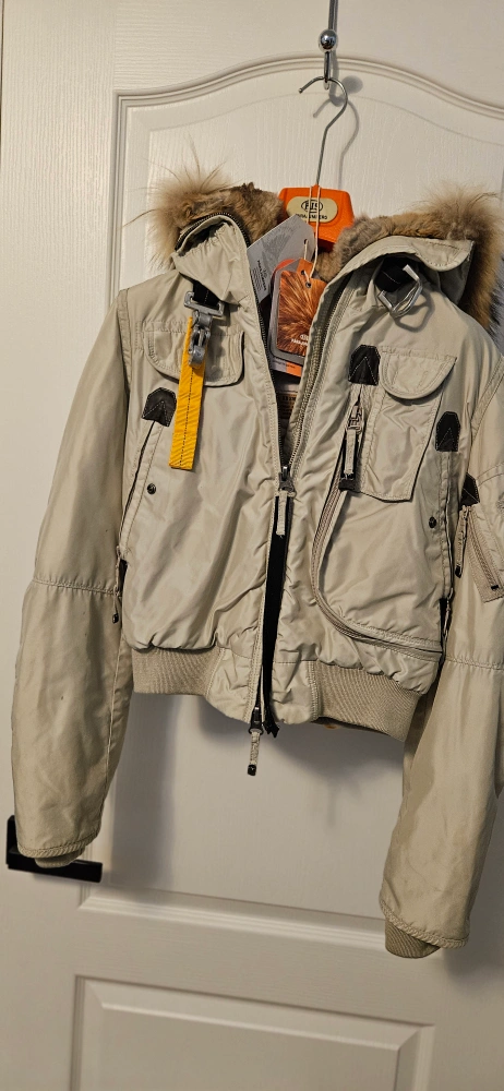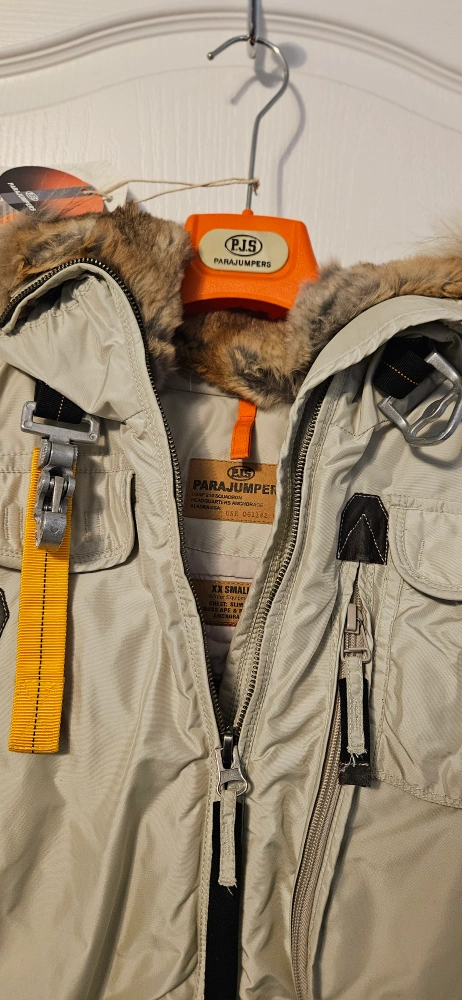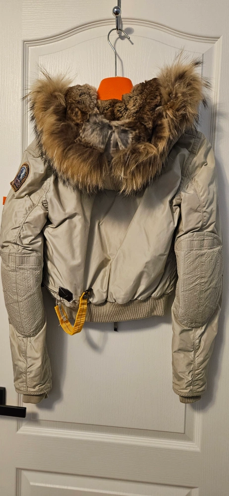Selling a Parajumpers down bomber jacket in size XXS. It's a stylish and warm jacket, perfect for the colder months! The jacket is beige and features a fur-trimmed hood and the signature Parajumpers yellow elastic strap. Professionally Cleaned from an Eco-friendly Dry Cleaner
