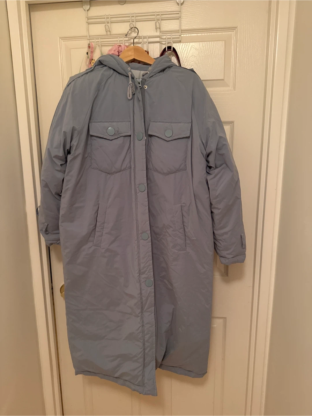 Here's a cozy blue puffer coat, perfect for chilly days! It's in great condition and ready to keep you warm and stylish