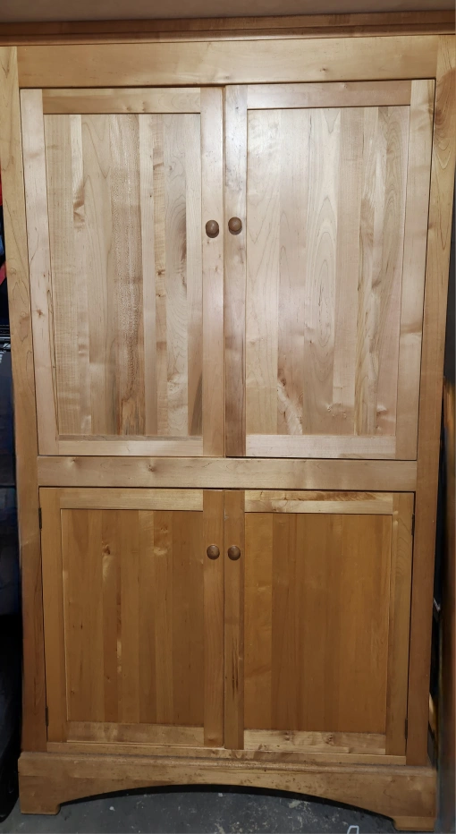 This solid wood armoire has retractable doors and an outlet. It features a light wood finish and includes drawers and shelving inside. The dimensions are approximately 77 inches high, 41 inches wide, and 25 inches deep. This piece also has wheels. Its beautiful but I need the space. Must have help to pick up.