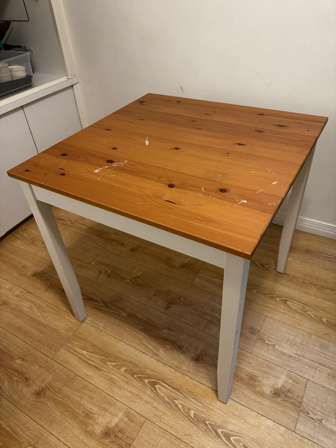 FREE IKEA Lerhamn table. It has a solid pine table top and white legs. There are some white paint stains on the table top, as shown in the pictures. It's sturdy and perfect for a small dining area or workspace
