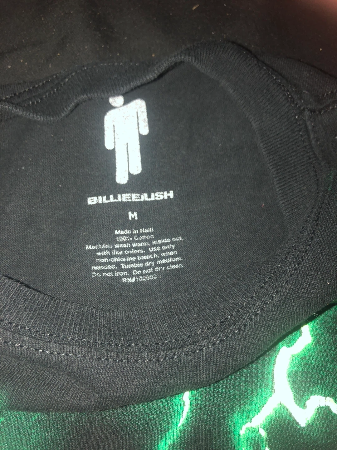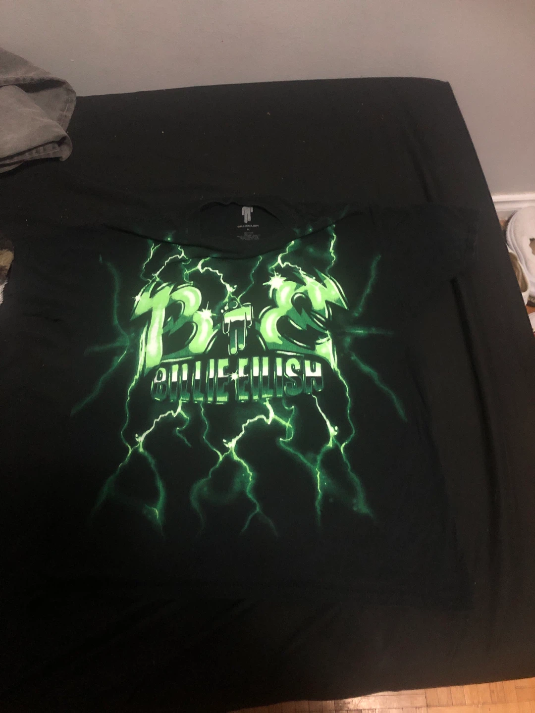 Selling a Billie Eilish graphic tee in size medium! The shirt is black and features a cool green lightning design. It's made of 100% cotton and is in great condition. Perfect for any Billie Eilish fan