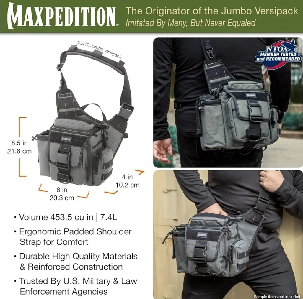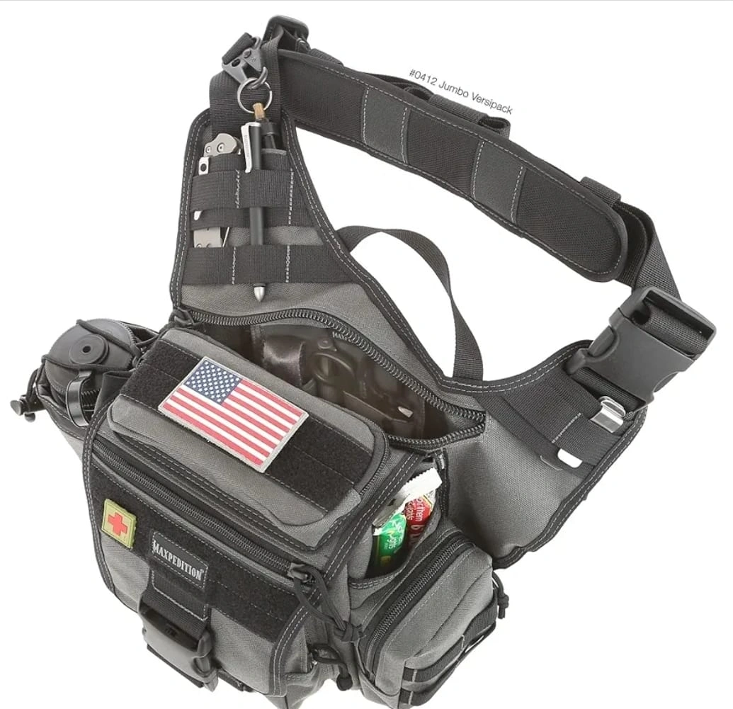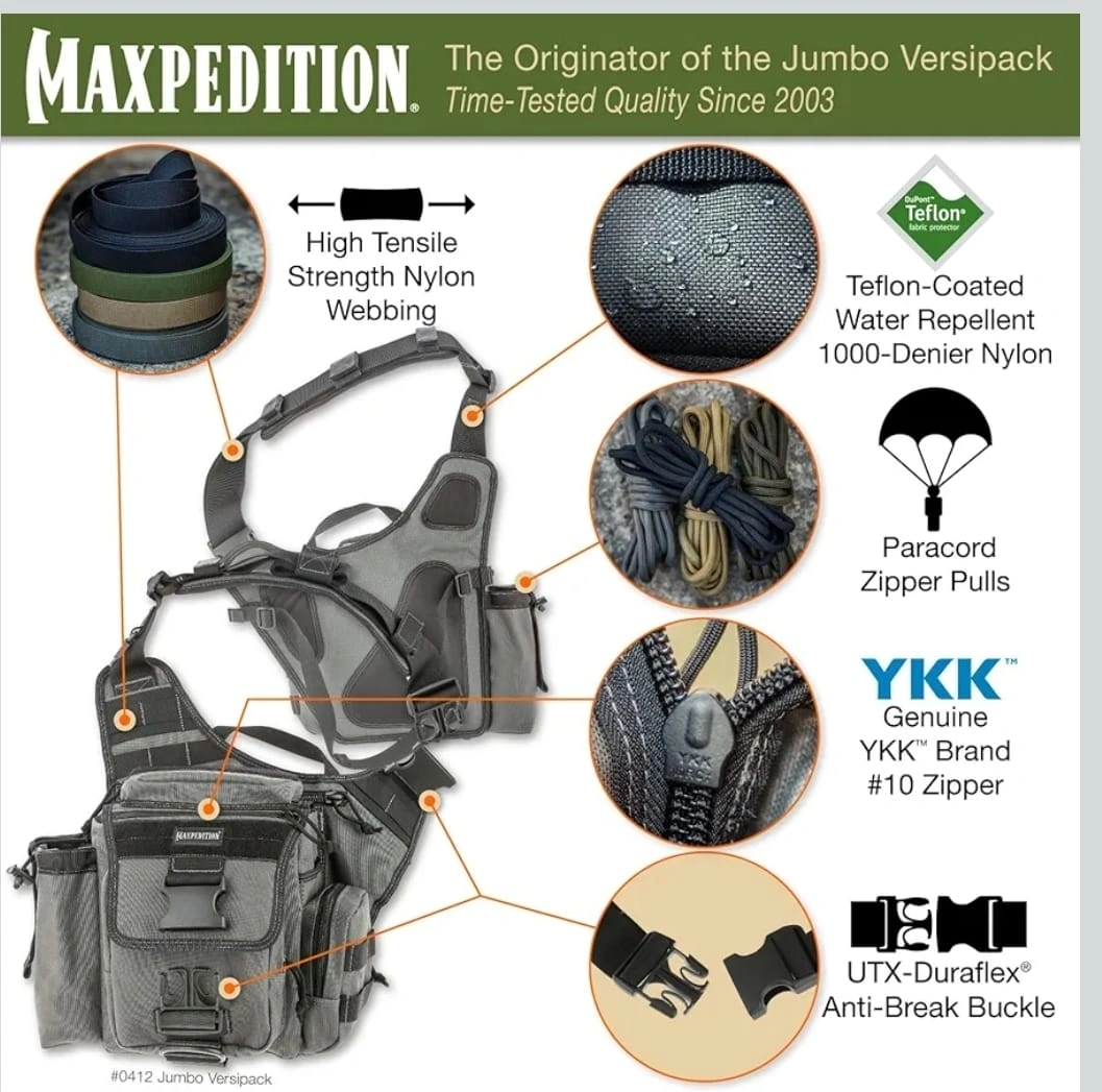 22Looking to sell my Maxpedition Jumbo Versipack! This bag is great for carrying all your essentials. It features high tensile strength nylon webbing, Teflon-coated water repellent 1000-Denier nylon, YKK zippers, and UTX-Duraflex anti-break buckles. It's a great bag for everyday use or outdoor adventures!