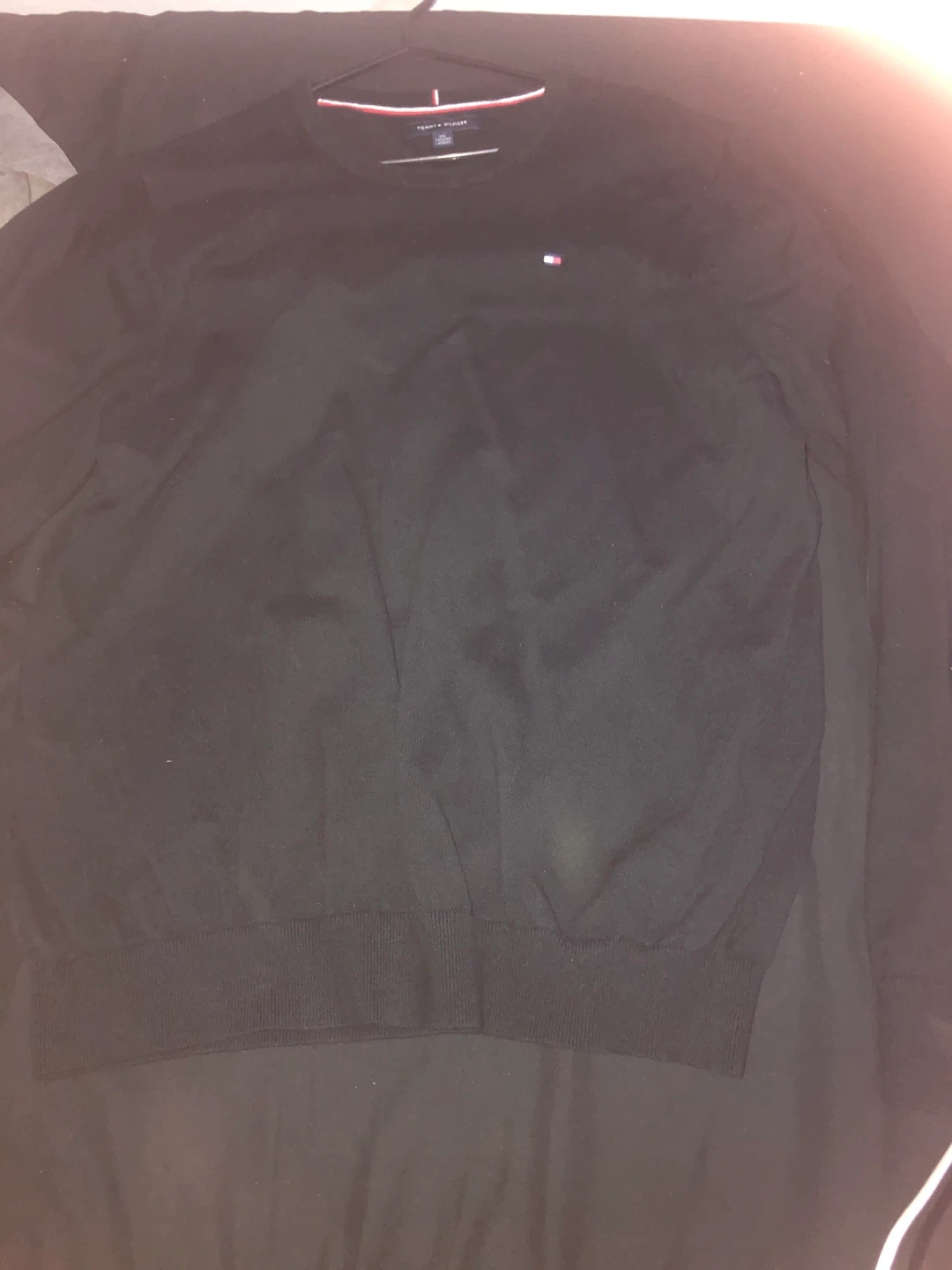 Selling a Tommy Hilfiger black sweater. It's in good condition and ready for a new home. Perfect for layering or wearing on its own. The classic design makes it a versatile addition to any wardrobe