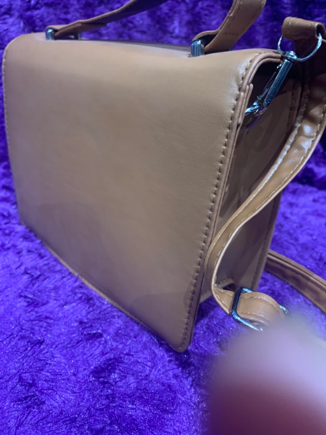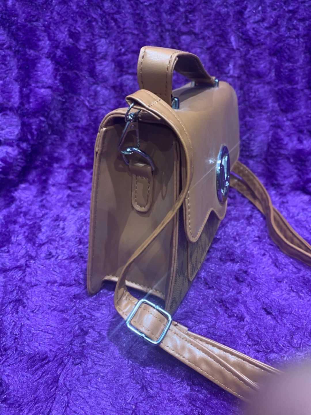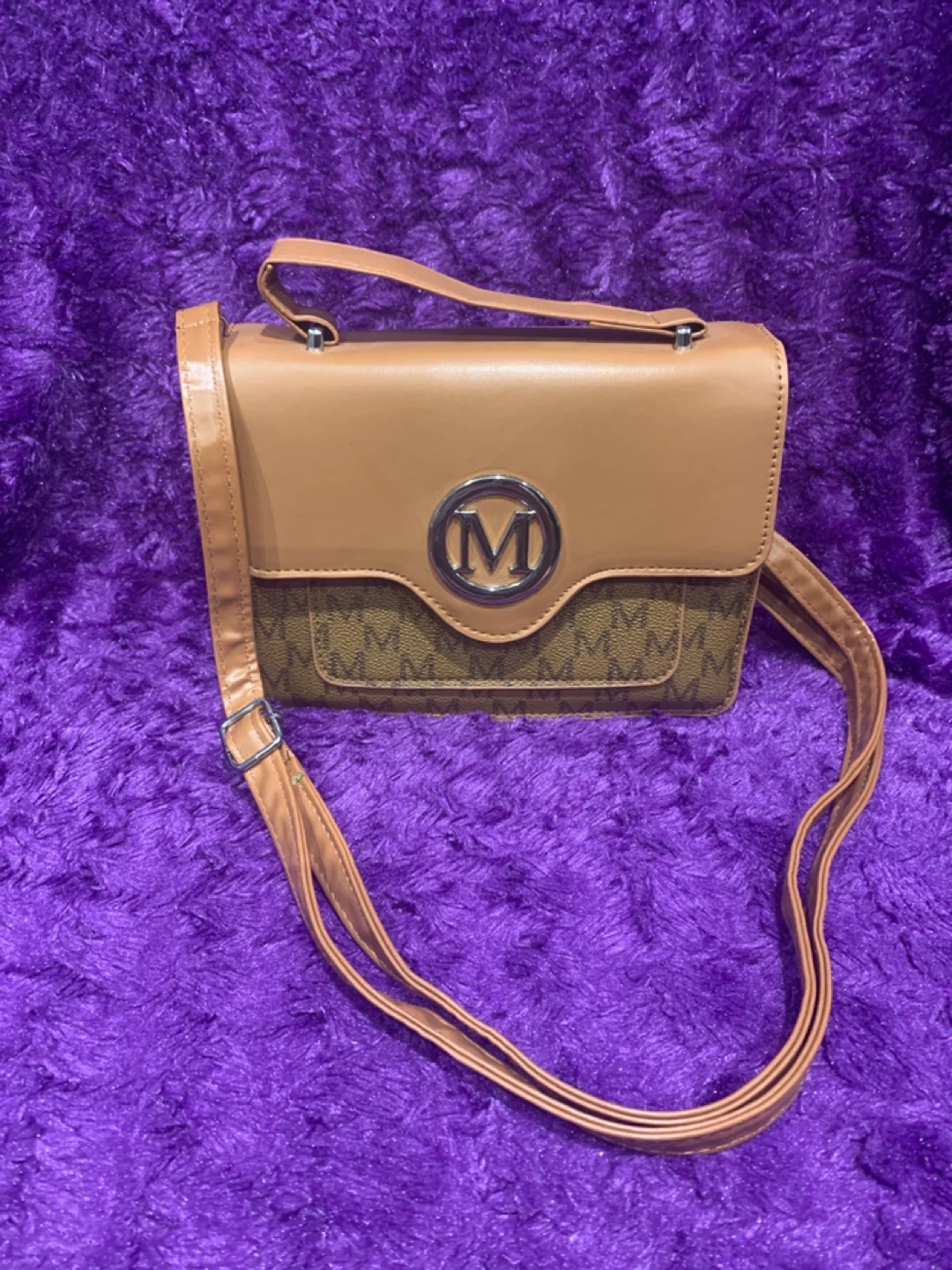 Here's a cute brown handbag featuring an 'M' logo! It's in great shape and ready for a new home. Perfect for adding a touch of style to any outfit