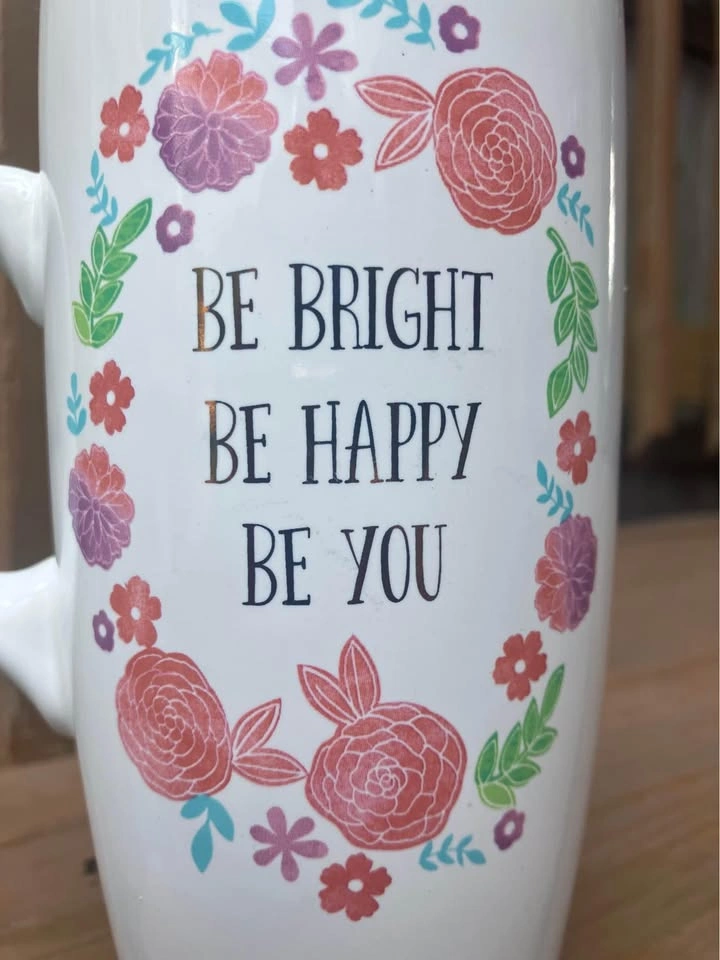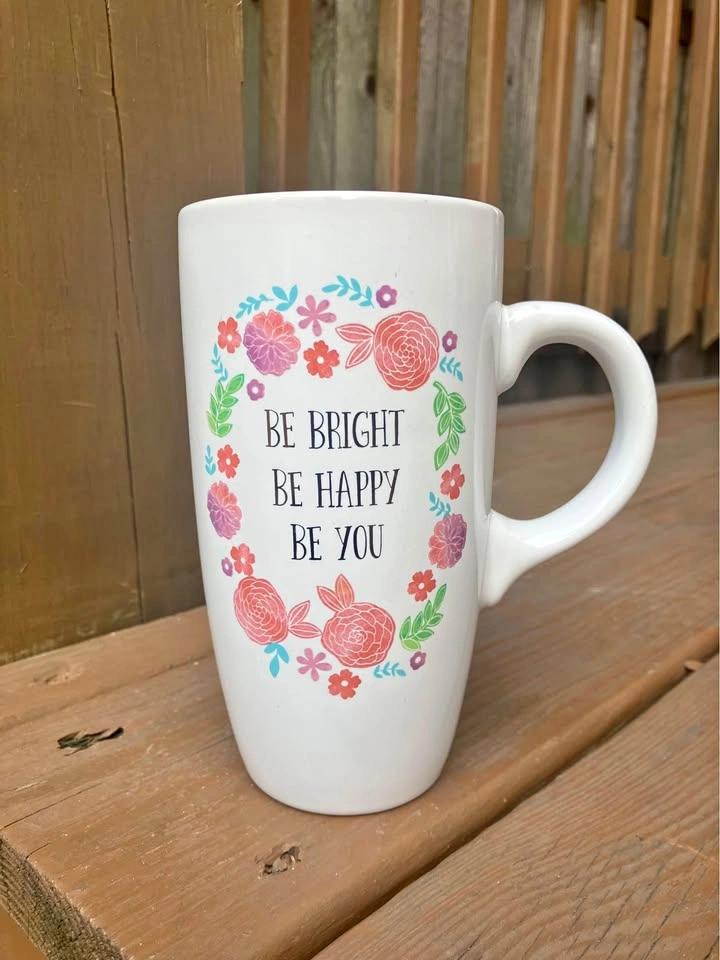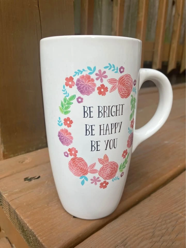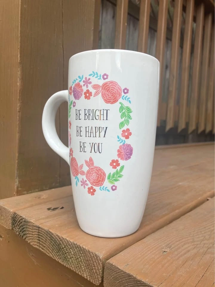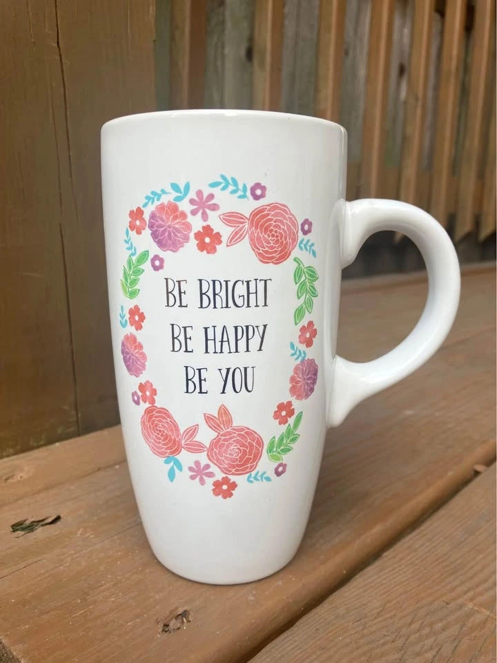 Sheffield Home “Be Bright Be Happy Be You” 18 Oz Coffee Mug - Like New Coffee/Tea mug measures 6.5” tall x 3.5” top diameter x 2.25” bottom diameter. Including handle it’s 5.5” wide. Jumbo 18 Oz. capacity. “Be Bright Be Happy Be You” logo is surrounded by a pink floral motif and is featured on both sides of the mug. From a smoke and pet free home. Check out in person before purchasing. Thanks for looking.