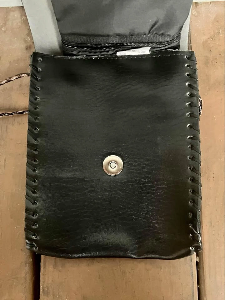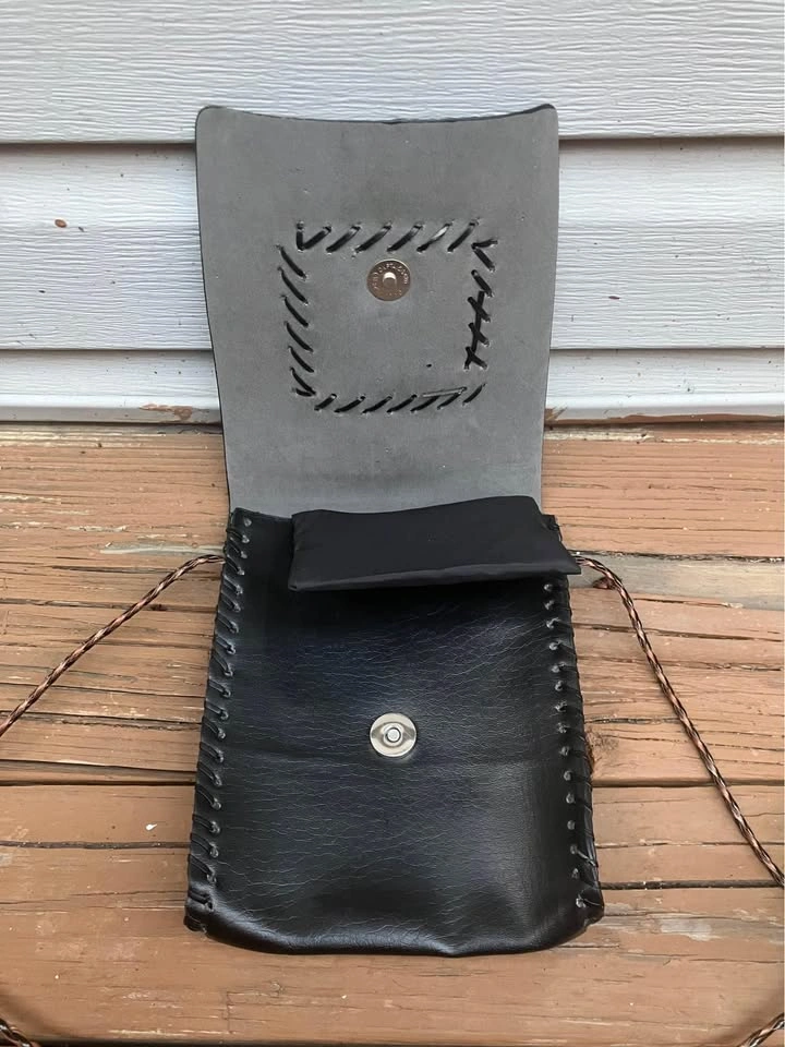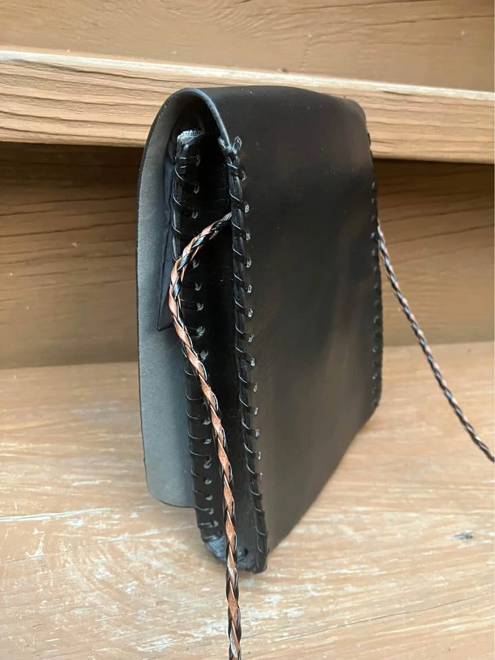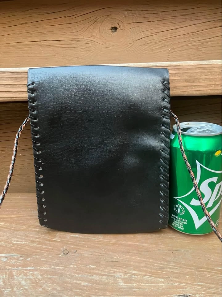 I believe it’s made of leather but buyer can have a look for themselves. Single snap enclosure and with a 44” corded strap. Foldout 3” x 4” zippered coin pouch. From a smoke and pet free home. Check out in person before purchasing. Thanks for looking.