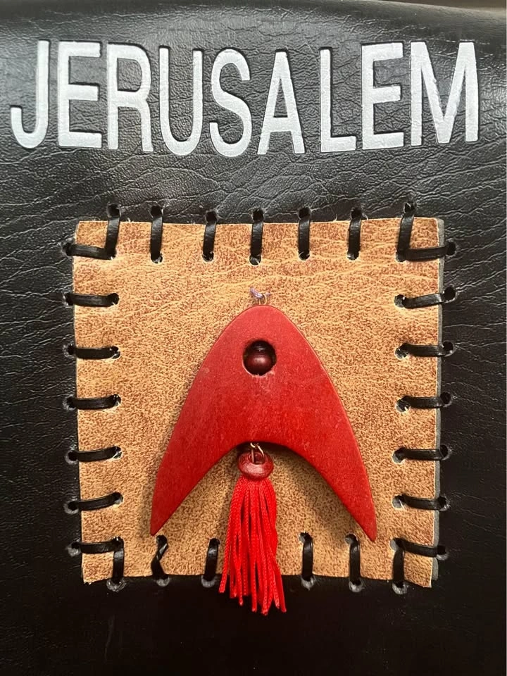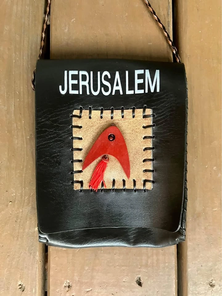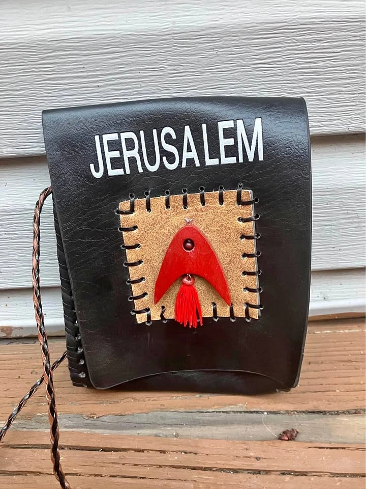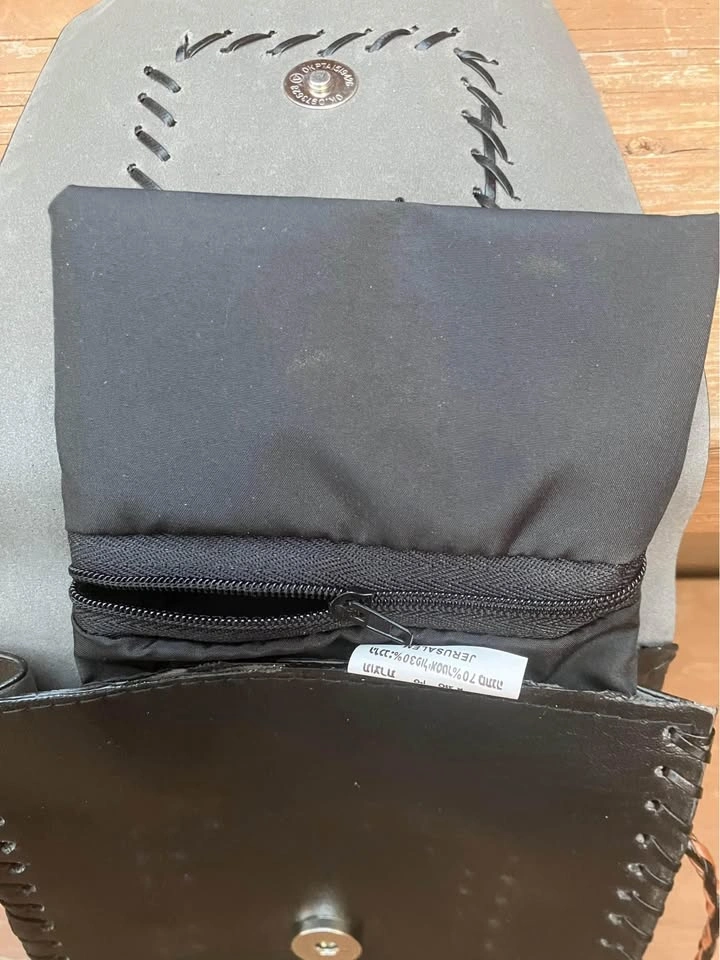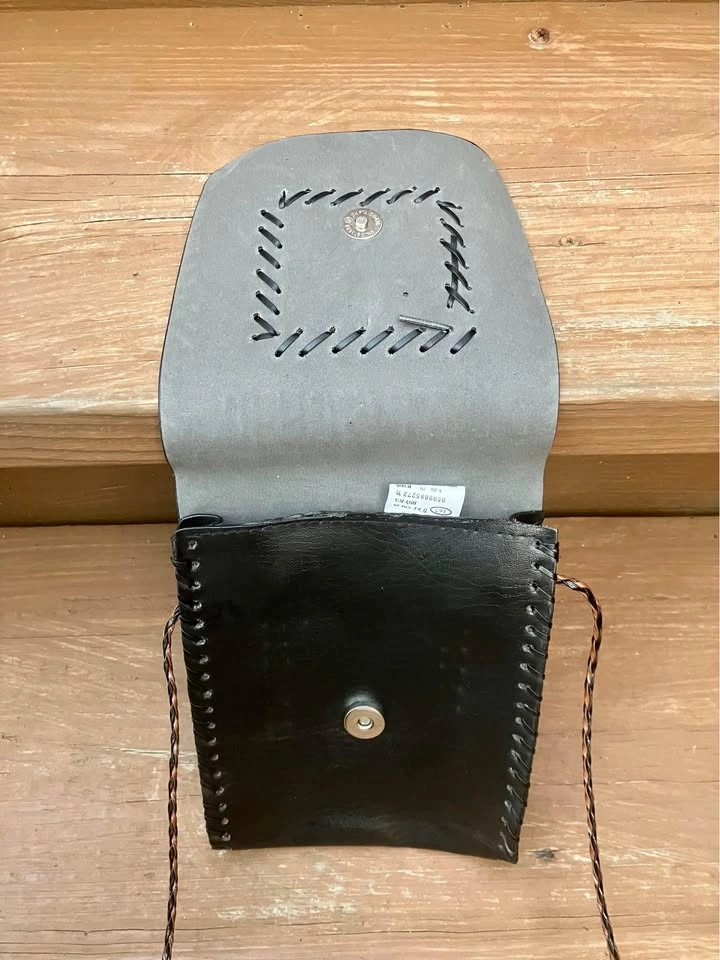 I believe it’s made of leather but buyer can have a look for themselves. Single snap enclosure and with a 44” corded strap. Foldout 3” x 4” zippered coin pouch. From a smoke and pet free home. Check out in person before purchasing. Thanks for looking.