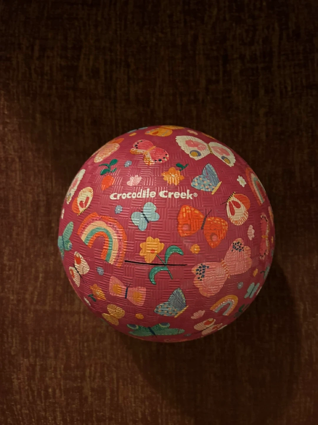 #giveaway Bought at Kaboodles on Cambie in July 2025! This is a Crocodile Creek playground ball in NEW condition! Never used! It features a fun butterfly and rainbow pattern on a pink background. Perfect for kids to play with outdoors! Bounces too! Great size to learn catch.